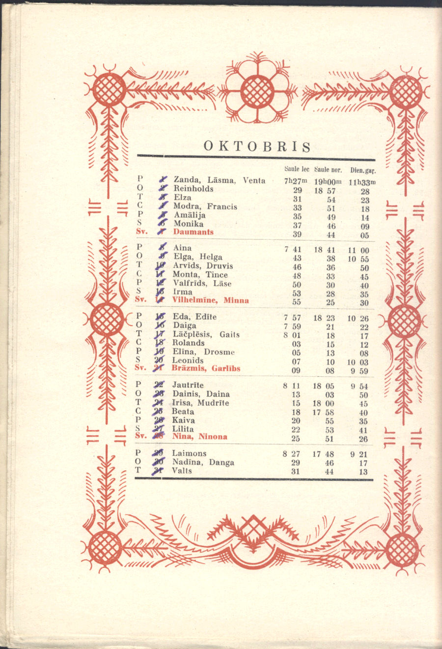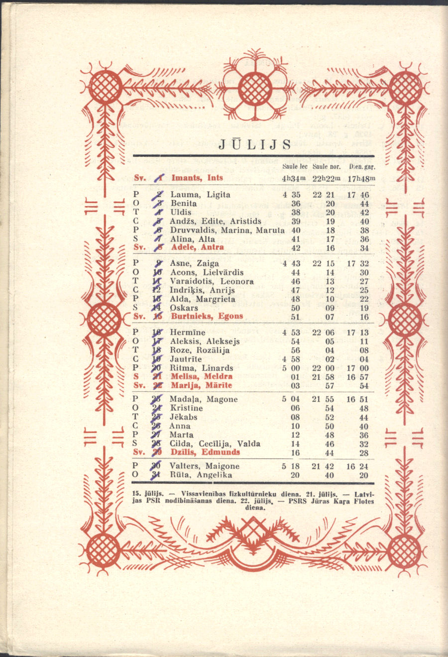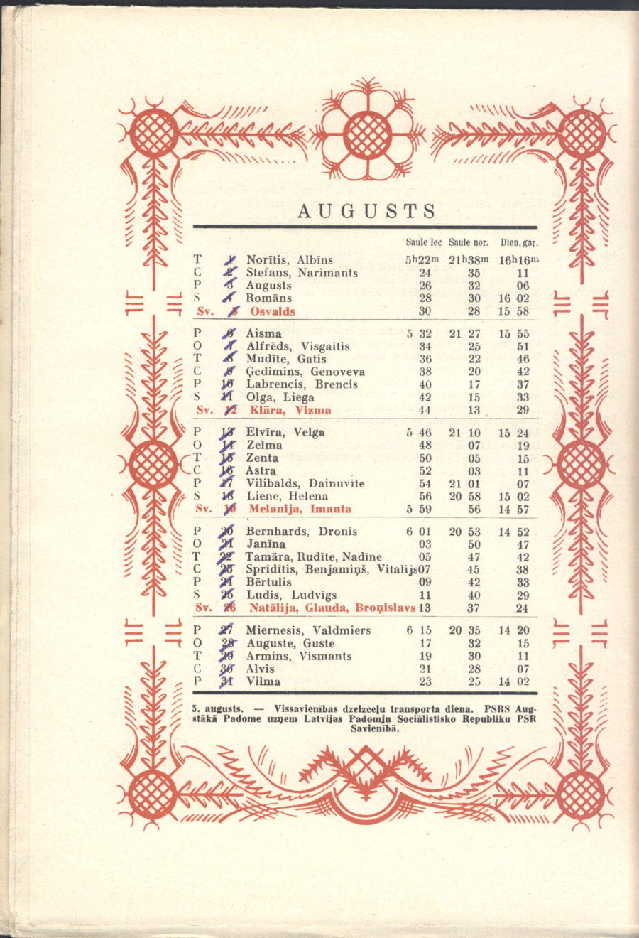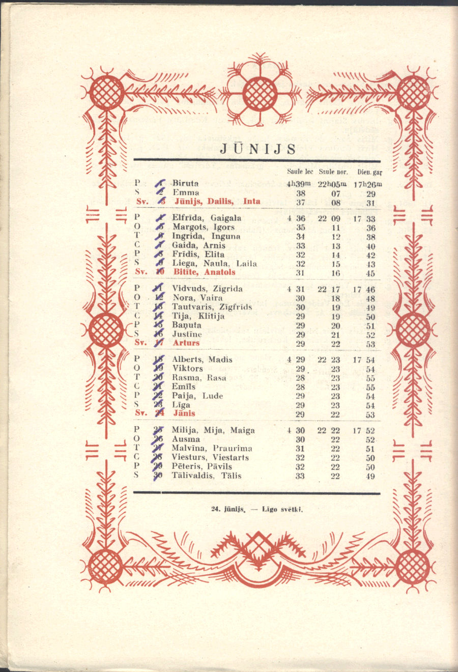 From our personal perspective, Sūniņš favorite themes were very much in keeping with that generation of Latvian painters, mirroring post-WWII exile Latvian art. Adapted from Sūniņš biography at Latvian Wikipedia. There's no indication if he was also the artist for the calendar pages' decorative border.