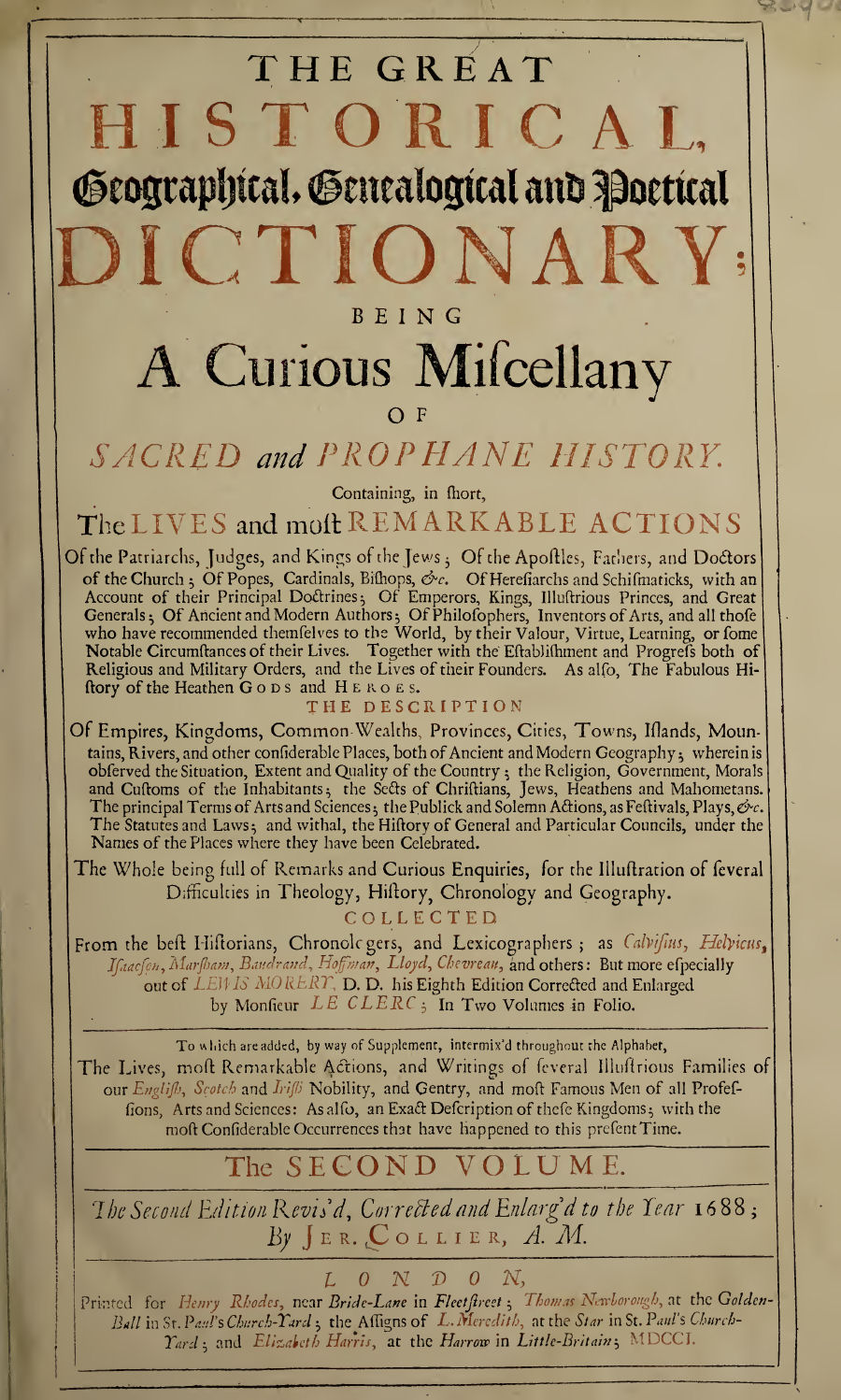 COLLECTED From the best Historians, Chronologers, and Lexicographers; as Calvisius↗, Helvicus↗, Isaacson↗, Marsham↗, Baudrand↗↗fr, Hoffman↗, Lloyd↗, Chevreau↗↗fr, and others : But more especially out of LEWIS MORERY↗, D.D. his Eighth Edition Corrected and Enlarged by Monsieur LE CLERC↗ ; In Two Volumes in Folio.
