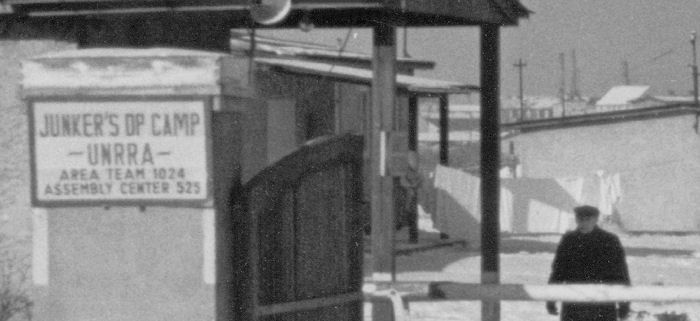 Detail of the original photograph stapled into the camp report. It appears on page 1, with two additional photographs on page 2.In 2011, we came across and purchased a typed manuscript report on the Junkers Displaced Persons (DP) Camp in Germany—ours appears to be a copy of the original completed in April, 1947. The title of the report and the sign at the gate to the camp:
