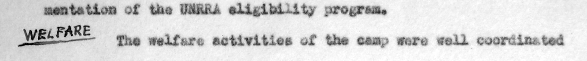 1The welfare activities of the camp were well coordinated under the able and devoted direction of the Principl Welfare Officer Miss Ferreira, who had supervision of all religious, educational, recreational and cultural activitie, as well as personal counseling, tracing, repatriation, emigration, workers' PX, labor control, registration and eligibility and screening.