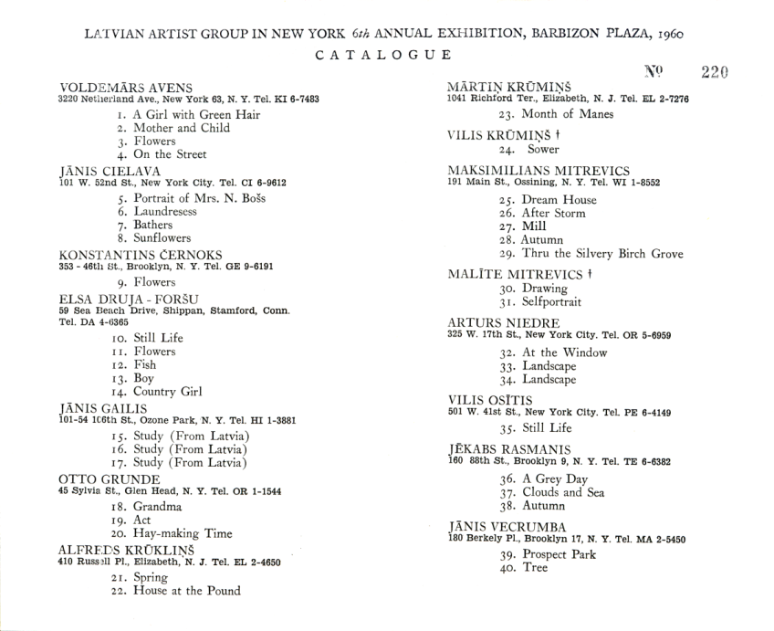 LATVIAN ARTIST GROUP IN NEW YORK 6th ANNUAL EXHIBITION, BARBIZON PLAZA, 1960