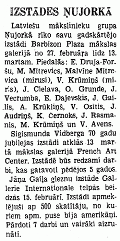 Latvia in America article on "Exhibitions in New York."6th Annual Exhibition, Barbizon PlazaFriday, February 27–Friday, March 13, 1960