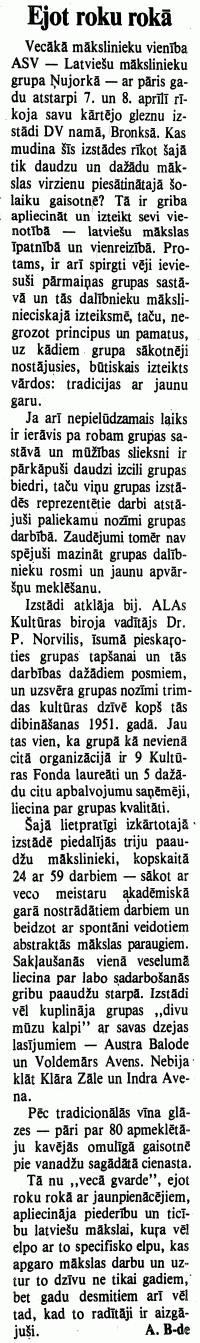 The oldest artists' organization in the USA — The Latvian Artist Group in New York — after a hiatus of a couple of years held its periodic art exhibition on April 7th and 8th at the Daugavas Vanagi House, in the Bronx. What prompts these exhibitions to be organized in this contemporary atmosphere saturated with voluminous and varied directions in art? It is the desire to affirm and express oneself in a union — the distinctness and uniqueness of Latvian art. Obviously, fresh winds have also brought changes to the membership of the group and in the artistic expression of its members, nevertheless, preserving the principles and foundations, upon with the group was first founded, fundamentally expressed in these words: traditions with a new spirit.
