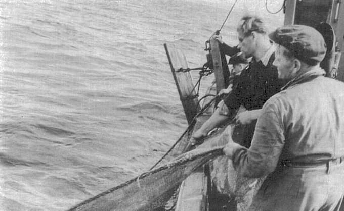 Latvian fisherman aboard a trawler of the 'Zveiniex'* fishing collective of the Saulkrastsky* District.* Double-transliterated, these should be "Zvejnieks" ("Fisherman") and Saulkrasti.