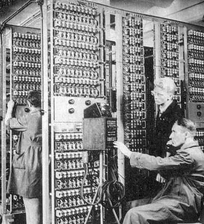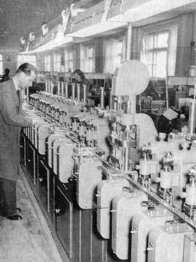 Electrical workers are assembling an automatic telephone exchange at the V.E.F. Factory, Riga.