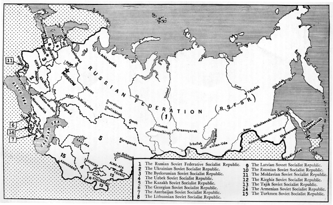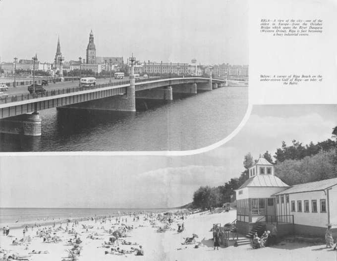 RIGA—A view of the city—one of the oldest in Europe—from the October Bridge which spans the River Daugava (Western Dvina). Riga is fast becoming a busy industrial center.
