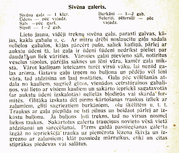 Use young, medium fatty pork, usually heads, feet [pigs knuckles], neck meat, etc. With a damp cloth wipe down the meat and divide it up into medium sized pieces, chop the feet in two, put it into a kettle, fill with cold water so that all the meat is covered (don't add too much water!) and boil. To the boiling meat add salt, skinned whole onions, the rest of the vegetables and simmer [boiling] until the meat is soft. It's advisable to keep a lid on the kettle, to not lose the aroma. Take the meat that's ready out of the bouillon and leave the rest to simmer slowly [until done], then let stand to cool and for it to settle. Separate the meat from the bones how best you please, cut into neat, even cubes, or you can use it with all the bones having prepared beforehand medium sized bowls (rinsed out with cold water) or into metal forms. For a neater look, before filling decorate the bowls with greens, neatly sliced carrots, egg slices, etc. Fill the dishes with meat, but not quite full, and finally pour over the bouillon through a sieve. If the bouillon is very fatty, then spoon the excess fat off the top. Take your prepared galerts dishes and put in a cool place to cool and congeal. Before serving at the table, unmold out of the dish onto a suitably shallow dish and decorate with greens; serve with horseradish, vinegar, and other strong garnishes or salad.