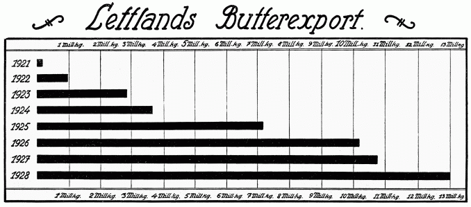 Dank der stürmischen Entwicklung der Milchwirtschaft ist Lettland in kurzer Zeit unter den butterexportierenden Ländern der Erde an einen beachtlichen Platz aufgerückt, so dass es im Jahre 1928 wie auch schon im vorhergegangenen Jahre an zehnter Stelle steht.