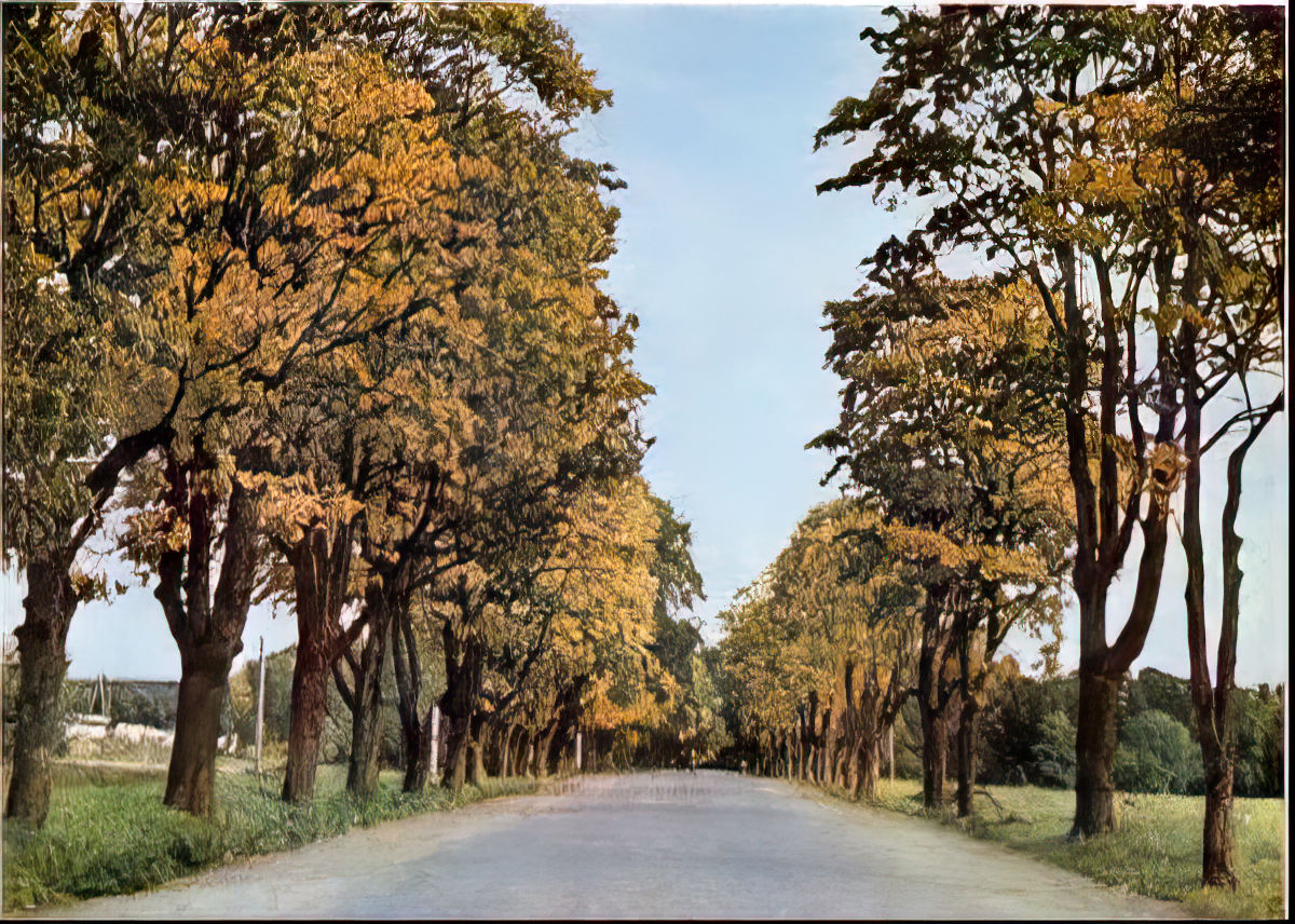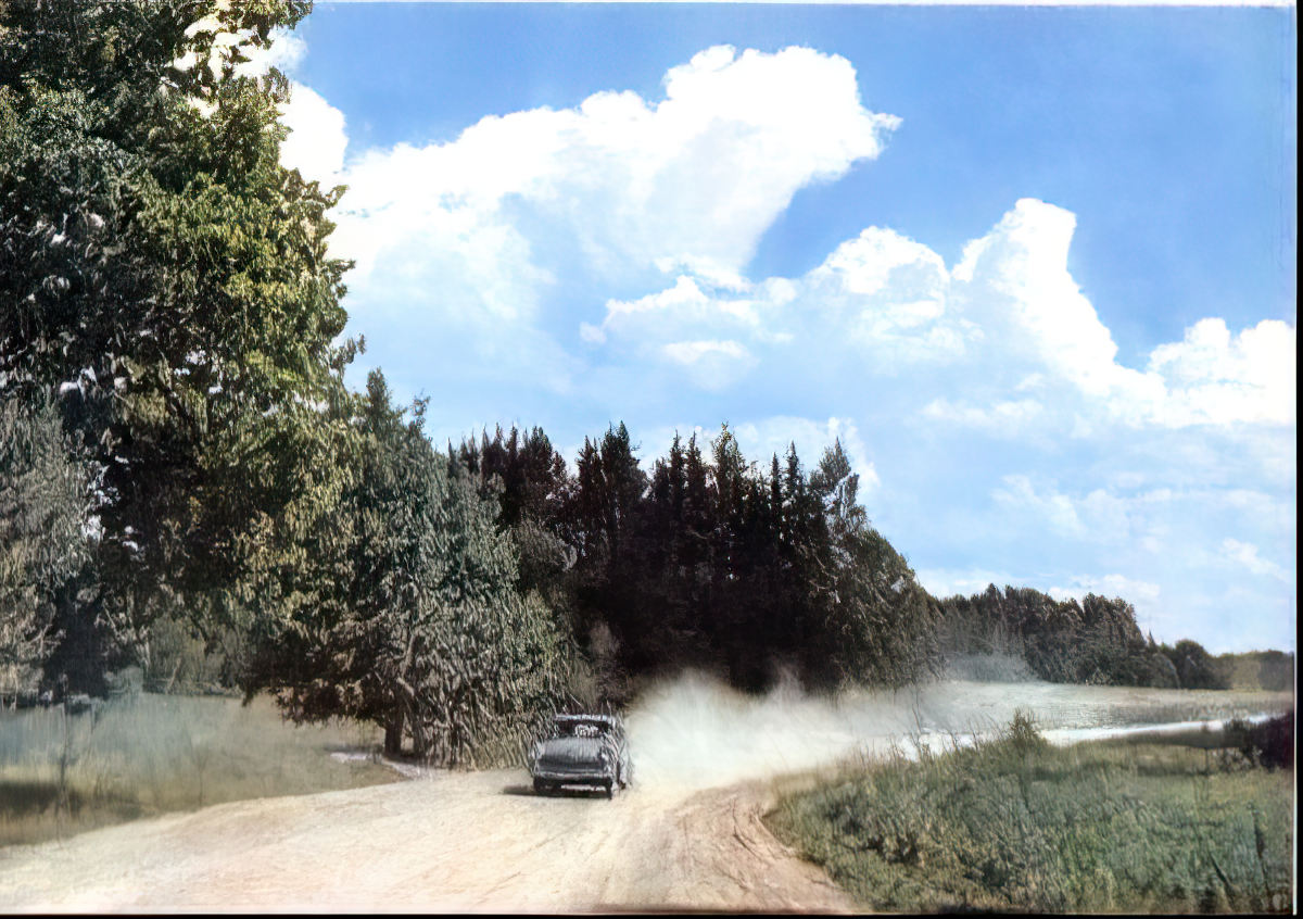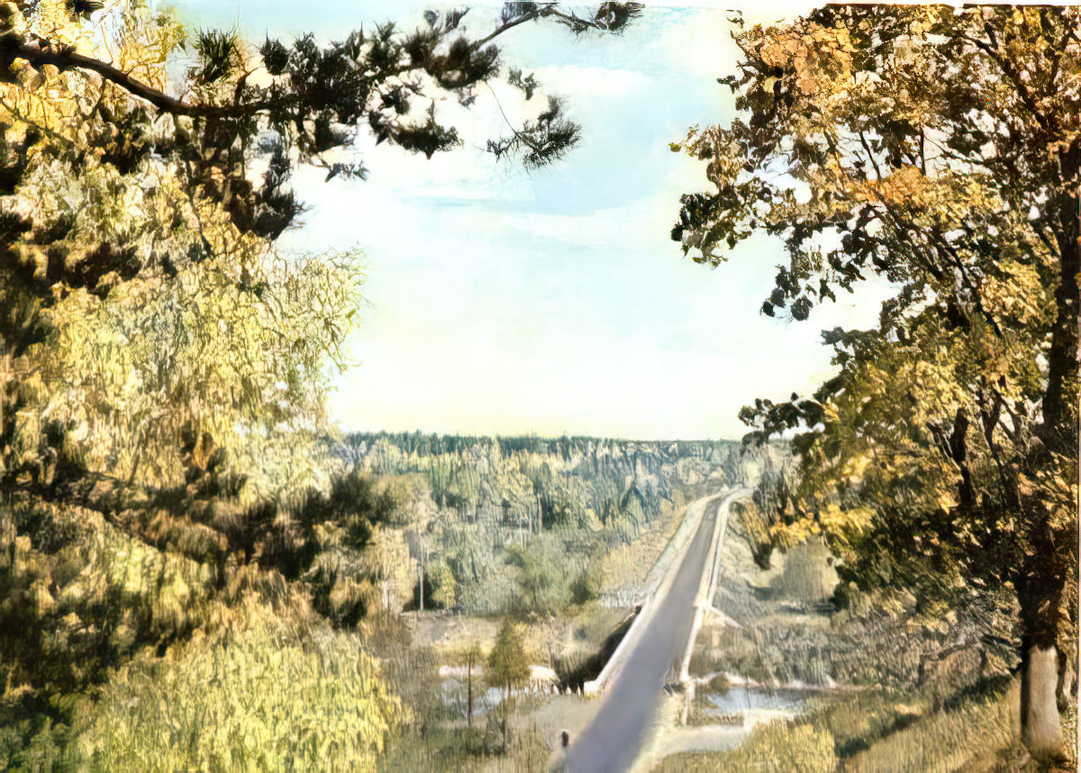 Still, there is a feeling of green unspoiled countryside, the charm of neatly tree-lined roads (with no mention it was Karlis Ulmanis' beautification project), and a sense of portraying Latvia's scenery at its best. And always those expansive blue skies and billowing white clouds.