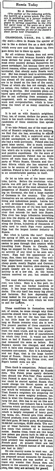 We bolded the section with Benenson's observations on the state of Latvia in 1927, still struggling to recover from the ravages of war. We have not been able to corroborate Benenson's account of Poland building new chemical weapons plants. This is possibly propaganda in the tradition of Russia accusing others of its own conduct—Bolshevik troops gassed Russians to put down the 1921 Tambov Rebellion↗.