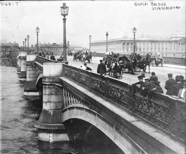 tide of Petersburg life — pedestrians of every nationality of the realm; mounted Cossacks, and officers resplendent with gold lace and orders; elegant barouches, on whose luxurious cushions recline titled ladies borne swiftly to their round of visits or morning drive; troikas, whose two horses trot briskly together, while the third, his head at right angles to them, gallops at the side; droskies, which the Marquis de Custine↗ aptly calls summer sledges, so low and small and convenient are they; policemen; companies of soldiers; groups of peasants; coachmen; porters; beggars; all, with their peculiar attire and strange speech, making up a panorama which you must go to the Neva to behold. Colossal works on every side, power,