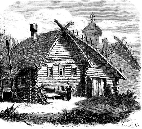 "Black people"6 and "black rooms" are the common names for the Russian peasants and their habitations. These houses are built of logs or rough boards, the cracks stuffed with moss, and the poorest have neither chimney nor window, except small apertures closed with shutters or oiled paper, through which a little of the smoke escapes, while the larger part settles in soot and grime upon walls and inmates, thus justifying the appellation. Often the house has but one room, with a fourth of the space occupied by the brick stove or oven, the top of which, with its broad, adjacent shelf, is the bed of the family during the cold season-the clothes rarely put off, and a piece of felt their only mattress and covering-while in summer they sleep upon the bench that, divan-like, encircles the apartment, or upon the ground beneath the sky. Sometimes the poultry are kept in the house during the winter, so as to be sure of eggs for Easter; and in the warmth and dirt of the place vermin breed and abound. Almost every family has its bath, a small detached room, with its oven and tubs for water; for bathing is their domestic luxury, and necessary to their religion, since without this purification by steam and scourge they are not admitted to Holy Communion. Indeed, for all Russians the vapor-bath↗ never loses its charm, and they carry it with them wherever they go. Freshfield↗, the recent English traveler in the Caucasus↗, speaks of the delight with which the Cossacks↗ at a lonely post-station, where wood was scarce and expensive, took possession of the bath-house after it had been heated and used by his party. In proof of its salutary effects the Russians point to the Finns, and say that their superiority to the Lapps↗ in size and comeliness is owing to their having learned to employ the vapor-bath.