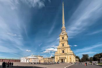 Why did the great Peter [the Great] choose this unpromising swamp for the site of his new town? Because Archangel was inaccessible for nine months of the year; because he wished to approach Europe rather than Asia, and his port on the Sea of Azof↗ being in the midst of Asiatic tribes, the mouth of the Neva was then the most desirable spot on Russian soil. It was in May, 1703, that he began the city by building a small fort on Vassili Island↗, one of the cluster of islands in the delta of the Neva. The poor Finns of the newly acquired district, prisoners of war, and thousands of peasants from the remote regions of the Empire, were drafted to transform the malarious marsh into a spot habitable for man. Multitudes died yearly from the effects of exposure, of the severity of the climate, and of superstitious fear; for the ruling priests and monks abhorred Peter's innovations, and represented his new city to the people as "one of the mouths of hell." But steadily the work went on. Forests were buried in the mud; the soil was drained and raised; a certain proportion of the inhabitants of other towns were compelled to make it their abode; and, as when St. Mark's↗ was building, every vessel leaving Venice↗ for the East was obliged to bring back marbles and pillars for the cathedral, so for years no ship or cart could come to Petersburg without bringing