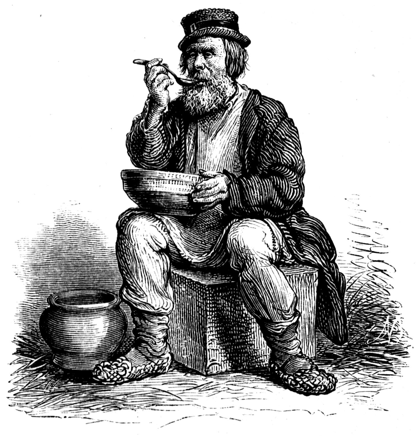 The most common articles of food are rye bread, fish or cabbage soup, salted cucumbers, caviare made from the roes of the sturgeon, with onions or garlic flavoring almost every dish. Meat is more rarely eaten, and even if they could obtain it the Church fasts prohibit it for over a third of the year. So rigidly are these fasts kept, that among the orthodox neither lard nor butter nor milk nor eggs are used, and many even avoid sugar because it is clarified with blood, and take honey in its stead; while for olive oil, too expensive to be commonly employed, hemp-seed oil is substituted, which when fresh is sweet and palatable. The favorite beverages are tea (decoctions↗ of various herbs and pepper-water sweetened with honey are used when Chinese tea cannot be procured); Yuass↗, a fermented liquor made by pouring boiling water on to black bread, or rye or barley meal; and vodky↗, the whisky of the country. Drunkenness is their especial vice; but intoxication never makes them quarrelsome — they sing, they embrace each other, they sit in a stupid maze, but they do not fight or rave — and it is so common, even among the priests, that little disgrace attaches to it.