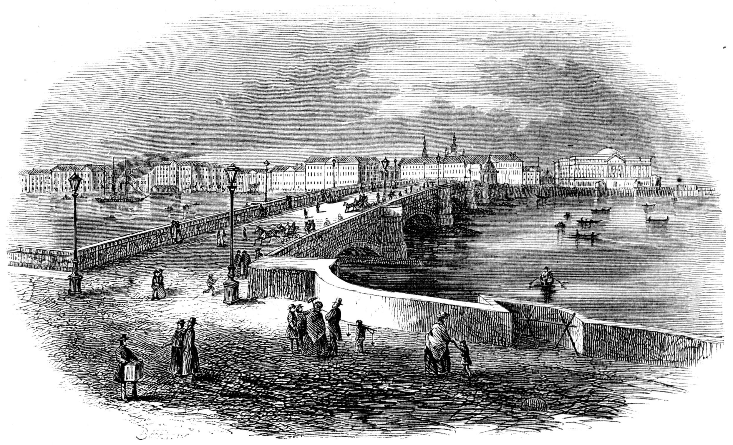The canals, like the river, are walled with granite and crossed by numerous bridges. Of the three bridges that span the Great Neva, two are built of boats and removed in winter, and only the Nikolai bridge is permanent, crossing the river from a little below the Admiralty to Vassili Island. It is of iron, twelve hundred feet in length, with seven arches supported on granite piers, and a drawbridge at its northern end. The foundations for these piers were made, as on shore, by driving piles close together, row above row, all the way across the channel. Before its erection there were sometimes days together, at the breaking up of the ice, when there was no communication between