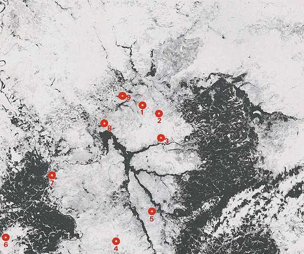 Presently many political prisoners have been placed in these prison camps. This USA satellite photograph of the area was taken on April 13, 1976. The ground is covered with snow.