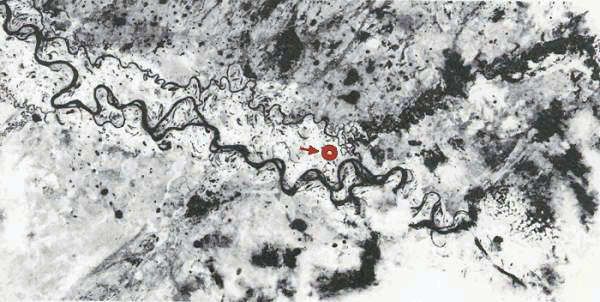 search along the northern bank of the Kanerovskaya River several kilometers northwest outside Kolpashevo itself uncovered the ruins of some sort of building complex. Otherwise there is nothing but tundra in every direction, punctuated only by tiny hamlets. Satellite view of some sort of former building complex on the Kanerovskaya River. |