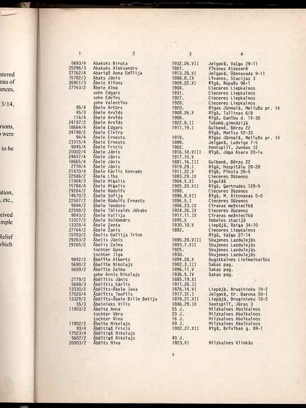 The data of those persons who were not reported by their relatives for registration, but who were registered on the ground of the data found in prison documents, etc., very often lack the last address. The same applies to military persons. In case the registered persons' whereabouts in exile were traced (or letters received from them there), a remark to this effect is to be found on the list, for example "deported to Karaganda". The list was compiled during the German occupation by the Latvian Relief Organization ("Tautas palidziba"), a substitute for the Latvian Red Cross, which was closed down, hence all explanatory remarks were made in German. |