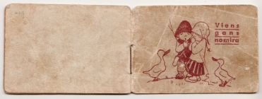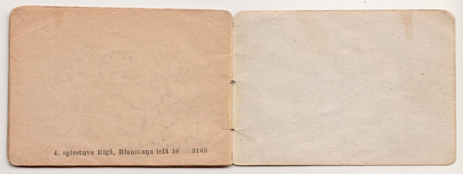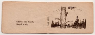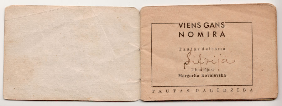 Cover graphicThis miniature folk song booklet caught our eye because it contained illustrations by Margarita Kovaļevska (1910–1999), a popular Latvian illustrator and writer — and one-time romantic interest of Peters' father while both attended the Latvian Academy of Art.1. We could tell it was a war-time publication, published by a charitable organization which had functioned under the Nazi German occupation.