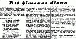 | 4 | Rīt ģimenes diena (Tēvija issue No. 112, page 2) Tautas Palīdzības sarīkojumā rīt notiks Ģimenes diena. Atklāšanas akts pl. 10 Drāmatiskajā teātrī. Runās Tautas Palīdzības priekšnieks iekšlietu ģenerākdirektors ģenerālis O. Dankers un prof. K. Kundziņš. Sekojošā koncertā piedalās T. P. bērnu koris Milzarāja vadībā, trio — prof. A. Ozoliņš (čello), A. Norītis (vijole) un B. Ozoliņa (klavieres) — un solisti H. Lūse, T. Matiss un A. Norītis. Ieeja bez maksas. Svētbrīdis Brāļu kapos pie Mātes tēla notiks pl. 13 un svētbrīdis Meža kapos boļševiku noslepkavoto kopējā kapu vietā pl. 13.30. Svētbrīžus vadīs archibīskaps prof. T. Grīnbergs un mācītājs Stange. Dziedās Reitera koris. Ģimenes dienas svinīgajā aktā rīt ģenerālis O. Dankers pasniegs mātes kartes 12 mātēm. Rīt notiks arī ziedojumu vākšana ar vācelītēm. Tieši ģimenes dienā rīt atminēsimies tos mazos grūtdieņus, kuŗu vecāki un gādnieki boļševiku valdīšanas laikā nomocīti čekas pagrabos via aizvesti uz padomiju. Tautas Palīdzība līdz šim gādājusi it sevišķi par daudzbērnu ģimenēm un bērniem, kas palikuši bez gādātājiem, un rīt, ar devīgu roku ziedojot, mēs visi varam šo svētīgo darbu sekmēt. Rīt Tautas Palīdzība dos pārdošanā arī piecas miniātūrgrāmatiņas: Tautai un mūžībai, A. Brigaderes Annele, Tincīte un Julcīte, K. Skalbes Sāpju ceļš, tautas pasaka Maizes klaips un tautas dziesma Viens gans nomira. Oriģinālos izdevumus illustrējušas mākslinieces Erna Geistaute un Margarita Kovaļevska. Jaukie izdevumi sevišķu prieku sagādās mazajiem lasītājiem. Izdevumi rīt būs dabūjami pie ziedojuma vācējiem. Vāks ziedojumus ar listēm dzīvokļos no pl. 8—18. Lūgti visi Tautas palīdzības talcinieki un bij vācēji stāties aktīvā darbā un pieteikties savos tuvakos rajonos. Ceram, ka arī šī pavasaŗa ziedojumu iznākumi būs jo kupli un bagāti, jo vajadzības ir ļoti daudz un lielas. Centra tālrunis 34890. Ģimenes dienas svētvakara dievkalpojums šovakar pl. 19 Archibīskapa katedrālē prof. Alb. Freija vadībā. Piedalās dzied. L. Maršalka un ērģ. A. Prēdelis. Ģimenes dienas dievkalpojumu V. Ģertrūdes baznīcā rīt pl. 18 vadīs māc. A. Goba. |