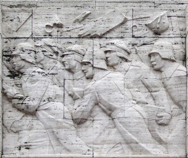 Freedom Monument bas relief, the Battle on the Iron Bridge against Bermondt's forces↗↗lv, October–December, 1919. Peters' photo.