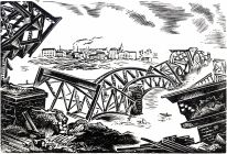 "Daugava River bridges, destroyed by the Germans," woodcut by K. Baumanis