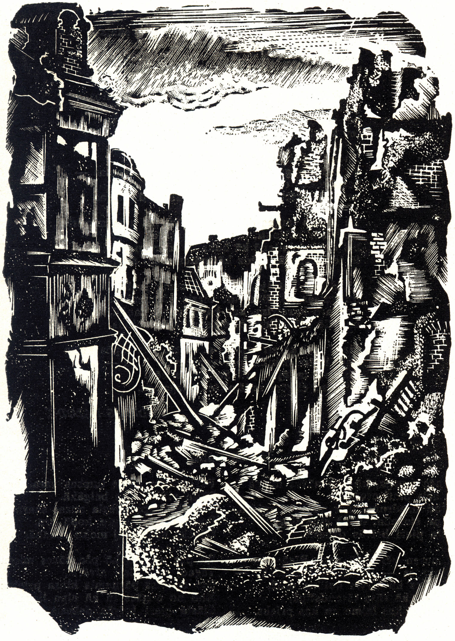 "Inner (Old) Rīga, destroyed by the Germans," woodcut by A. Junkers