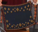 Reproduction of the shawl presented to the Stāmeriene parish in celebration of Latvia's centenary. Rather than being woven, its design featuring 37 swastikas in 20 different variations is fashioned using 6,970 bronze ringlets.