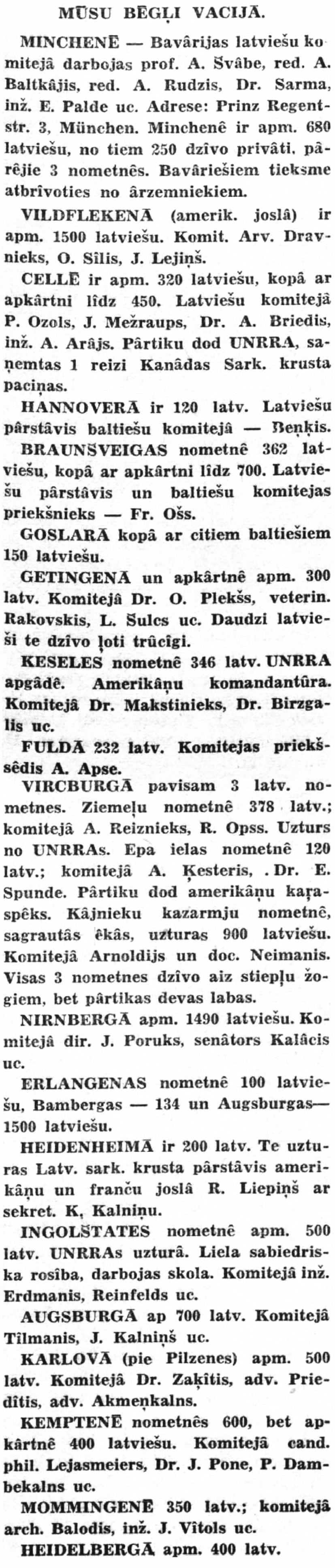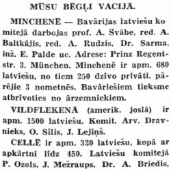 IN MUNICH — The Latvian Committee of Bavaria includes Prof. A. Švābe, Editor A. Baltkājis, Editor A. Rudzis, Dr. Sarma, Engineer E. Palde, and others. Address: Prinz Regent-str. 3, Munich. There are approx. 680 Latvians in Munich, 250 of whom live privately, the rest in 3 camps. Bavarians have a tendency to free themselves of foreigners.