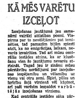 Izceļošanas jautājumā jau samanāmi vairāki attīstības posmi. Vispirms par to nevēlējāmies pat ieminēties, tad pamazām bijām spiesti atzīt, ka no emigrācijas, laikam, nevarēs izvairīties. Tad ari mūsu centrālās iestādes atzina, ka ar klusēšanu vien šo jautājumu nevarēs atrisināt. Tagad jau ir zināmi mūsu pārstāvību norādījumi par izceļošanas iespējamību un vēlamību uz vienu vai otru zemi. Šķiet, pūles un izrīcību šajā virzienā vēl kāpinot, ari paši varēsim iespaidot varbūtējās izceļošanas virzienu.
