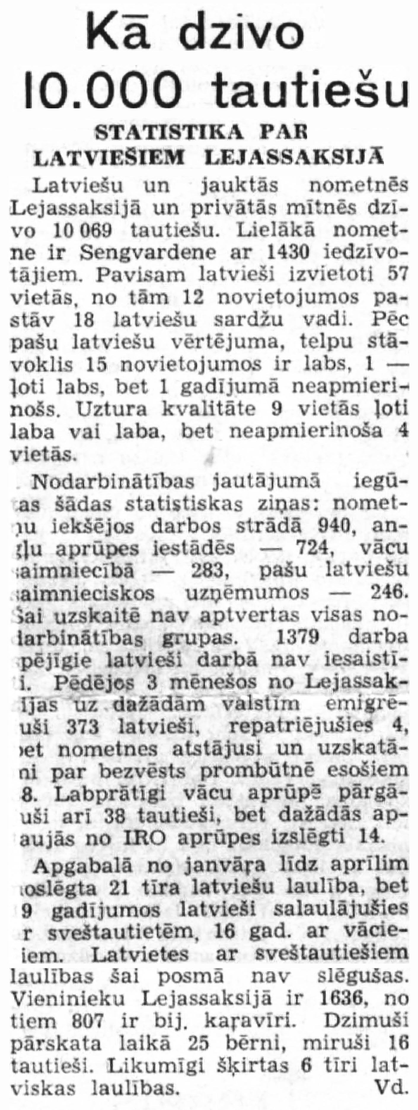 Nodarbinātības jautājumā iegūtas šādas stētiskas ziņas: nometņu iekšējos darbos strādā 940, angļu aprūpes iestādēs — 724, vācu saimniecībā — 283, pašu latviešu saimnieciskos uzņēmumos — 246. Šai uzskaitē nav aptvertas visas nodarbinātības grupas. 1379 darba spējīgie latvieši darbā nav iesaistīti. Pēdējos 3 mēnešos no Lejassakcijas uz dažādām valstīm emigrējuši 373 latvieši, repatriējušies 4, bet nometnes atstājusi un uzskatāmi par bezvēsts prombūtnē esošiem 38. Labprātīgi vācu aprūpē pārgāuši arī 38 tautieši, bet dažādās aptaujās no IRO aprūpes izslēgti 14.