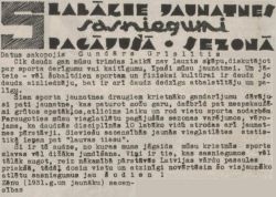 Šiem sporta jaunatnes draugiem krietnāko gandarījumu dāvājusi pati jaunatne, kas paturot možu garu, dažbrīd pat neapskaužami grūtos apstākļos, atlicina laiku un rod vietu sporta nodarbēm. Paraugoties mūsu vieglatlētu pagājušās sezonas varējumos, vērojams, ka daudzās disciplīnās 10 labāko vidū atrodas ari jaunatnes pārstāvji. Sieviešu sacensībās jaunās vieglatlētes statistikā ieņem pat "lauvas tiesu".