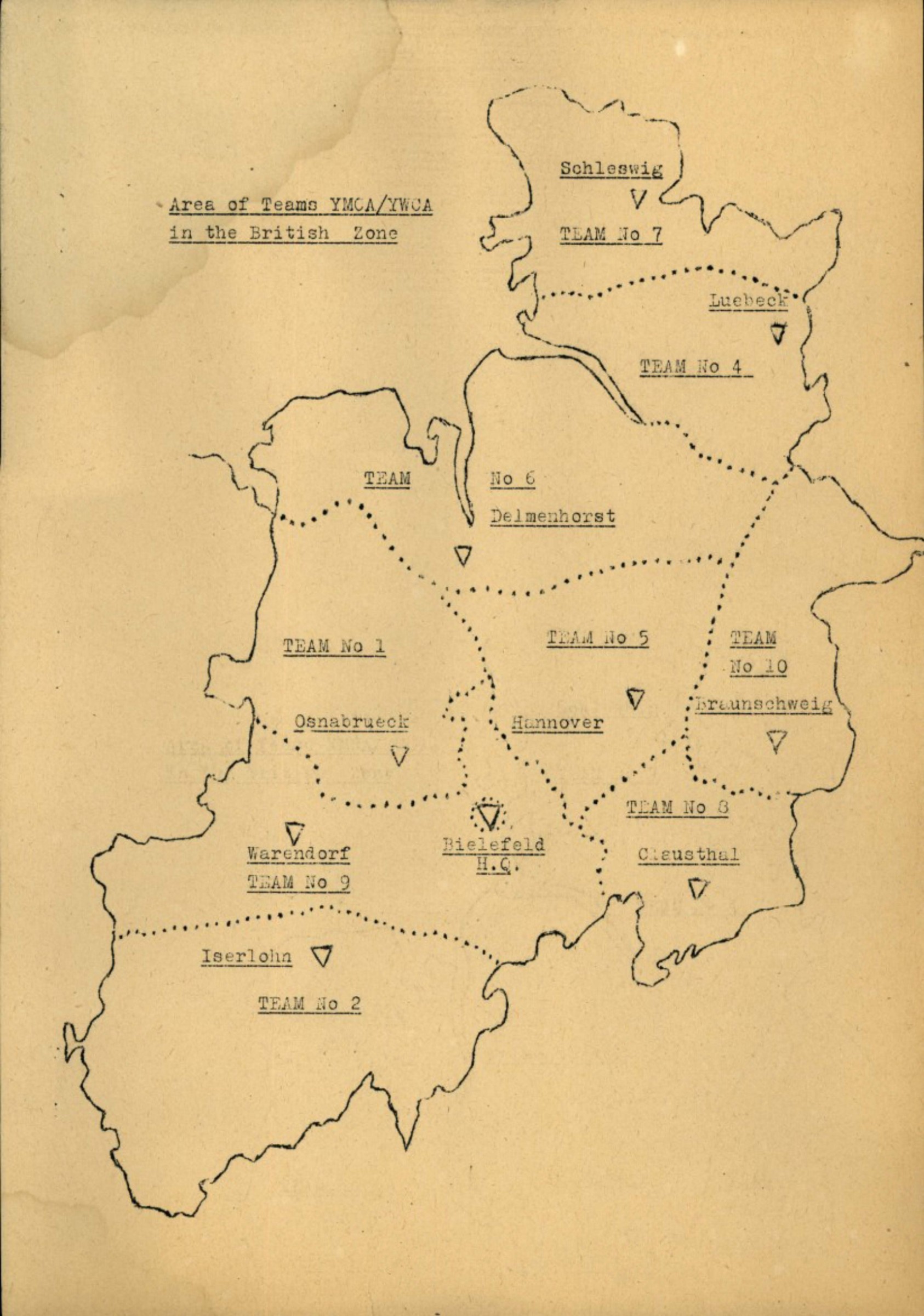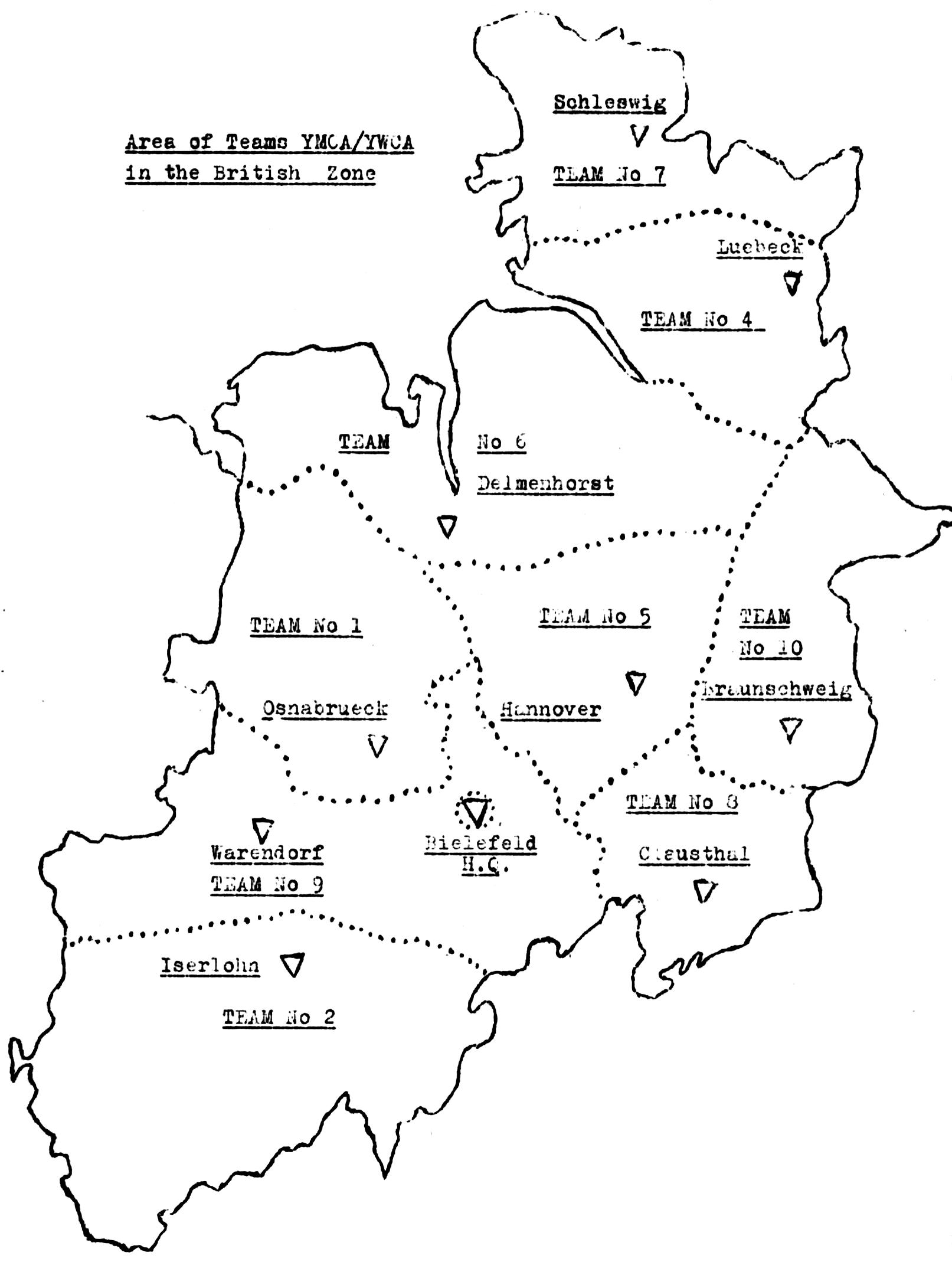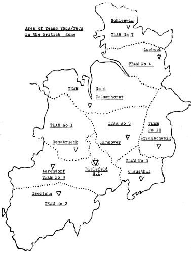 The following map shows the area of Teams YMCA/YWCA in the British Zone.
