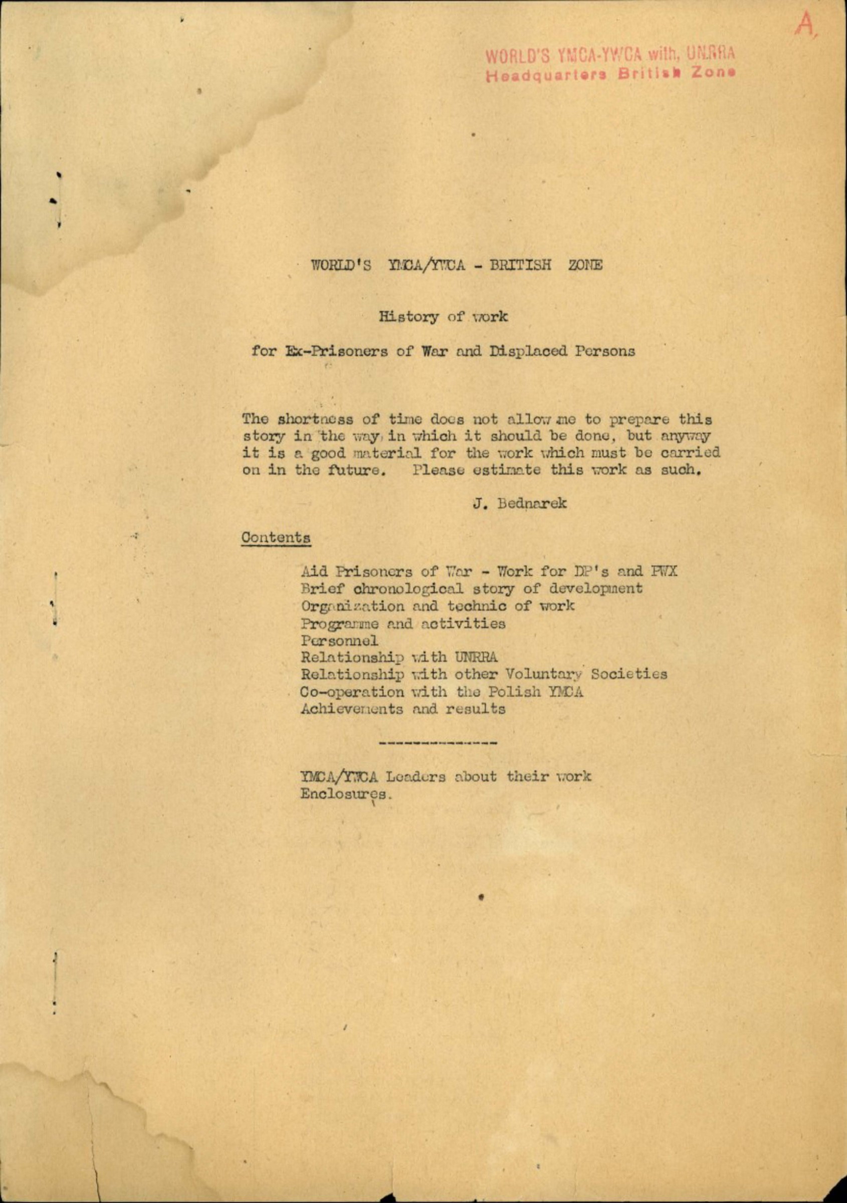 By August 9th, 1945, the proposal of World's YMCA/YWCA had been accepted by Combined DP Executive and a few days afterwards the World's YMCA/YWCA signed a common contract as one of 8 Voluntary Societies cooperating with UNRRA.
