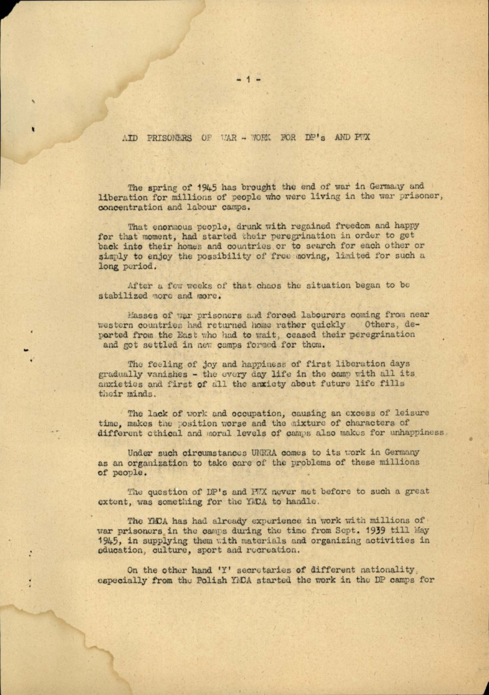 The YMCA has had already experience in work with millions of war prisoners in the camps during the time from Sept. 1939 till May in supplying them with materials and organizing activities in education, culture, sport and recreation.