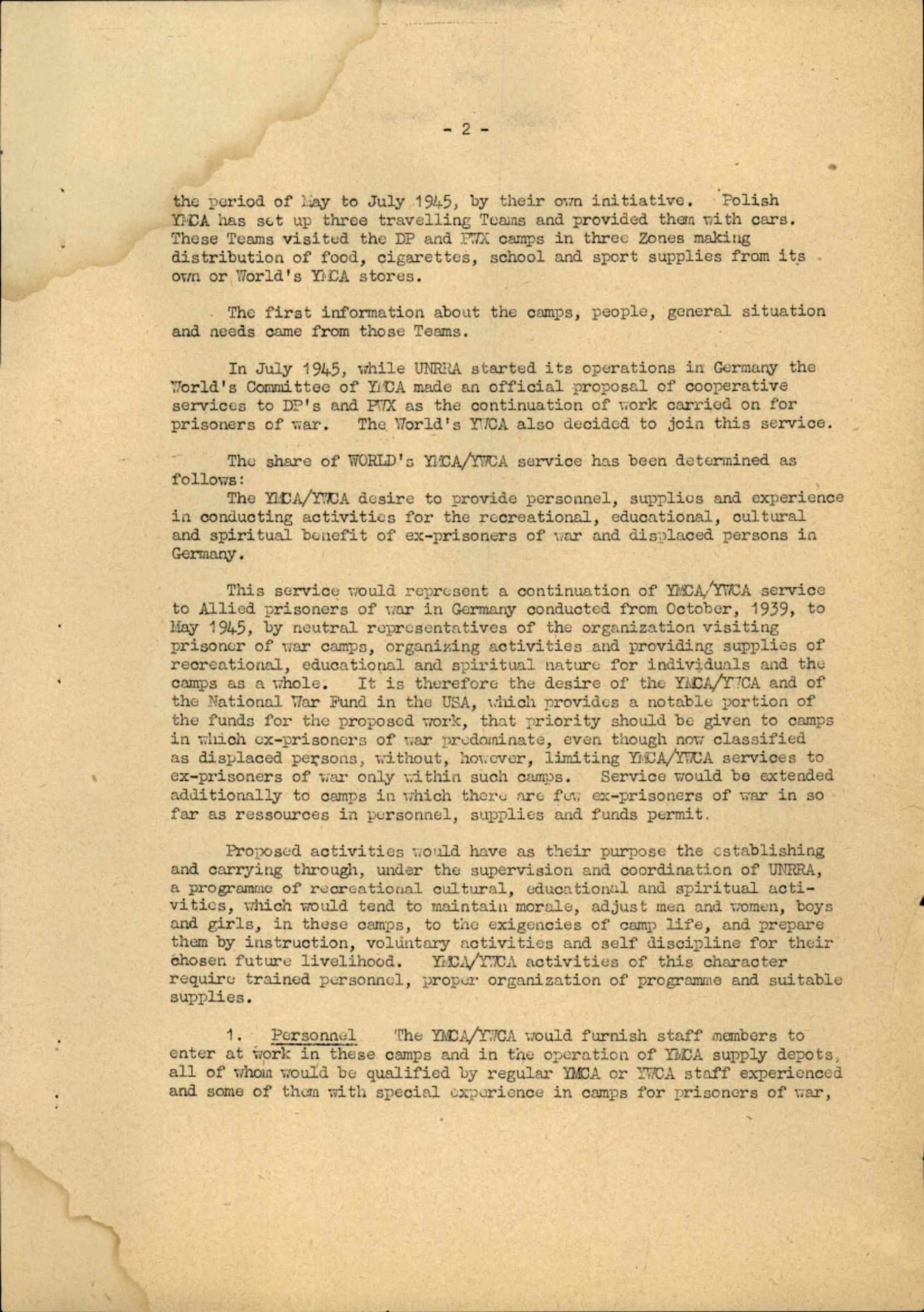 This service would represent a continuation of YMCA/YWCA service to Allied prisoners of war in Germany conducted from October, 1939, to May 1945, by neutral representatives of the organization visiting prisoner of war camps, organising activities and providing supplies of recreational, educational and spiritual nature for individuals and the camps as a whole. It is therefore the desire of the YMCA/YWCA and of the National War Fund in the USA, which provides a notable portion of the funds for the proposed work, that priority should be given to camps in which ex-prisoners of war predominate, even though now classified as displaced persons, without, however, limiting YMCA/YWCA services to ex-prisoners of war only within such camps. Service would be extended additionally to camps in which there are few ex-prisoners of war in so far as resources in personnel, supplies and funds permit.