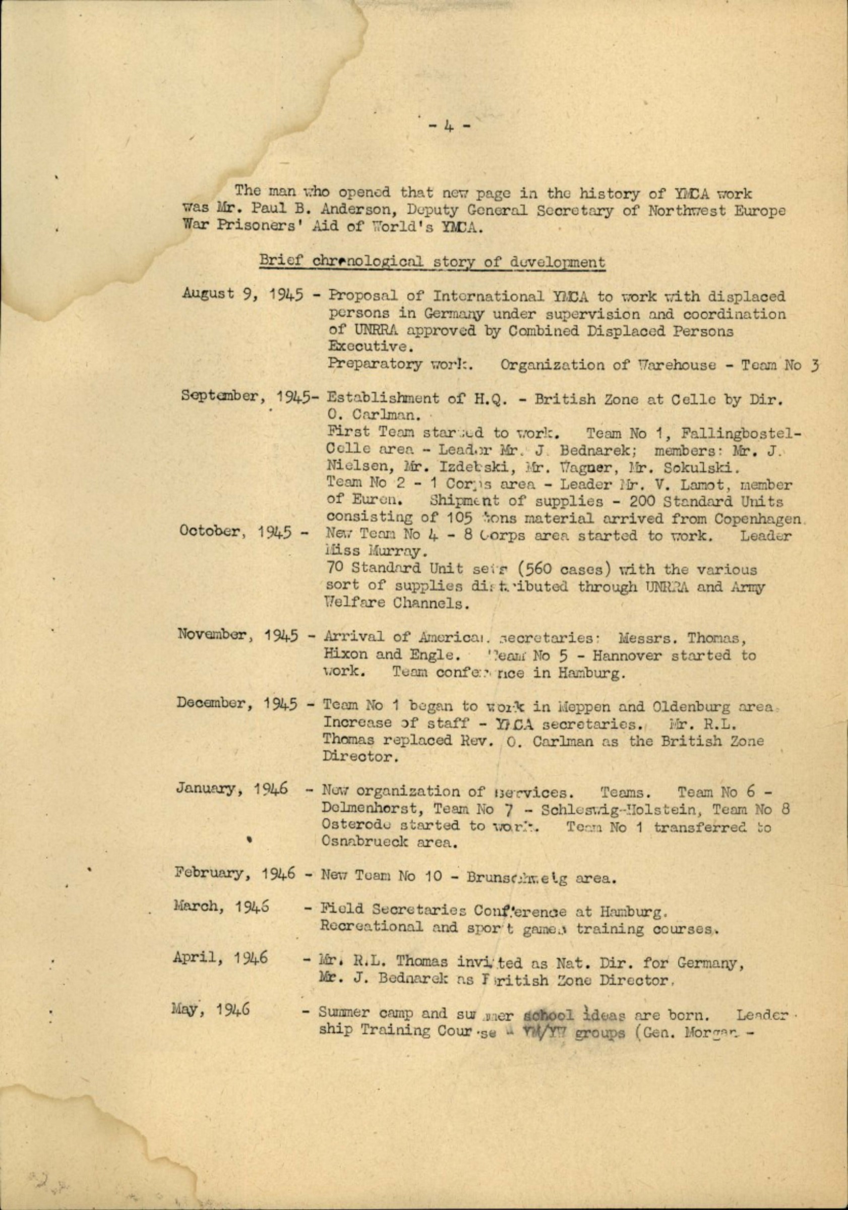 Speaking about the organization of work in the British Zone, I would like to mention the name of Mr. R.L. Thomas, the present National Director for Germany, who created this organization and settled the co-operation between the YMCA/YWCA Teams and UNRRA.