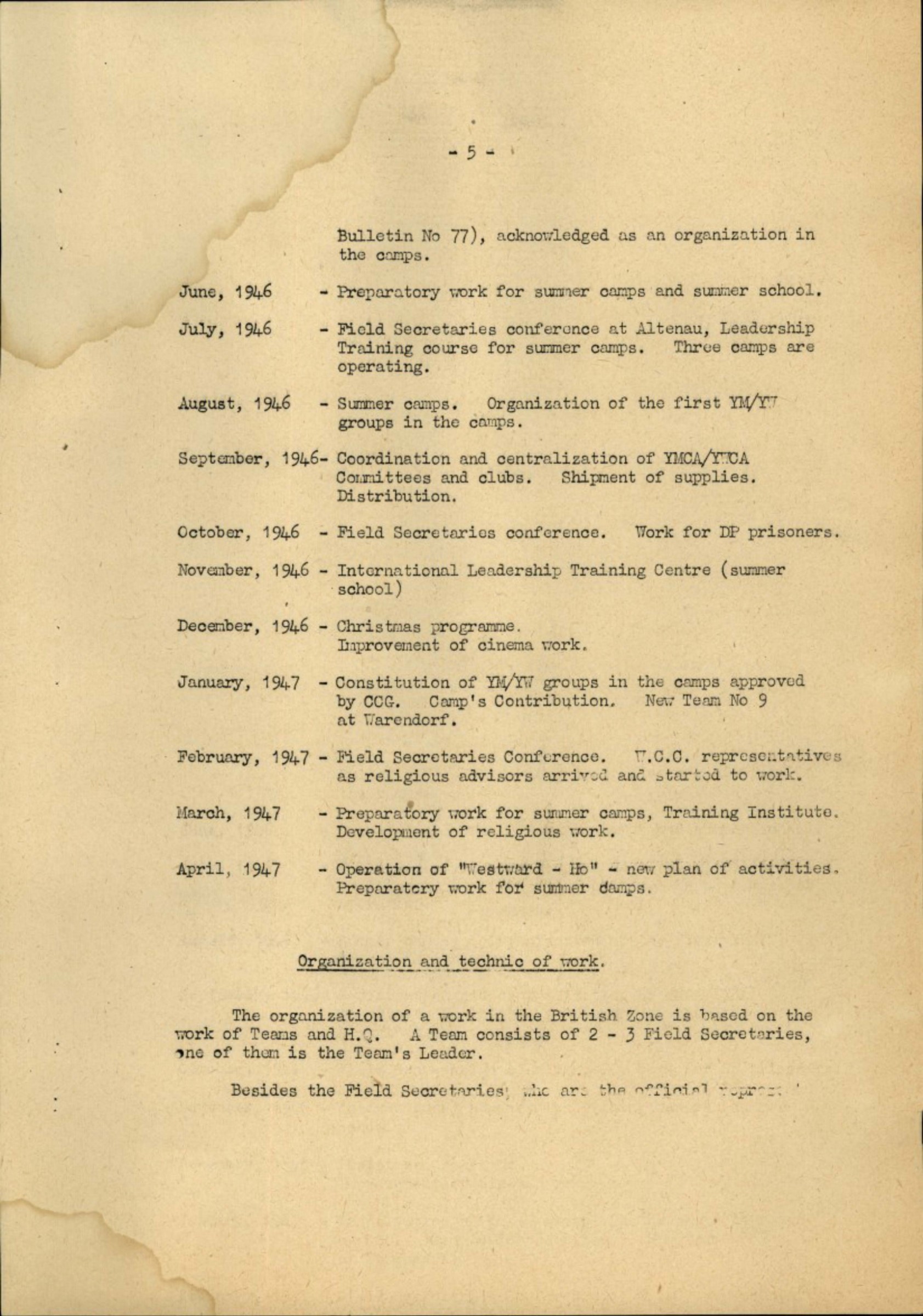 The organization of a work in the British Zone is based on the work of Teams and H.Q. A Team consists of 2 - 3 Field Secretaries, one of them is the Team's Leader.