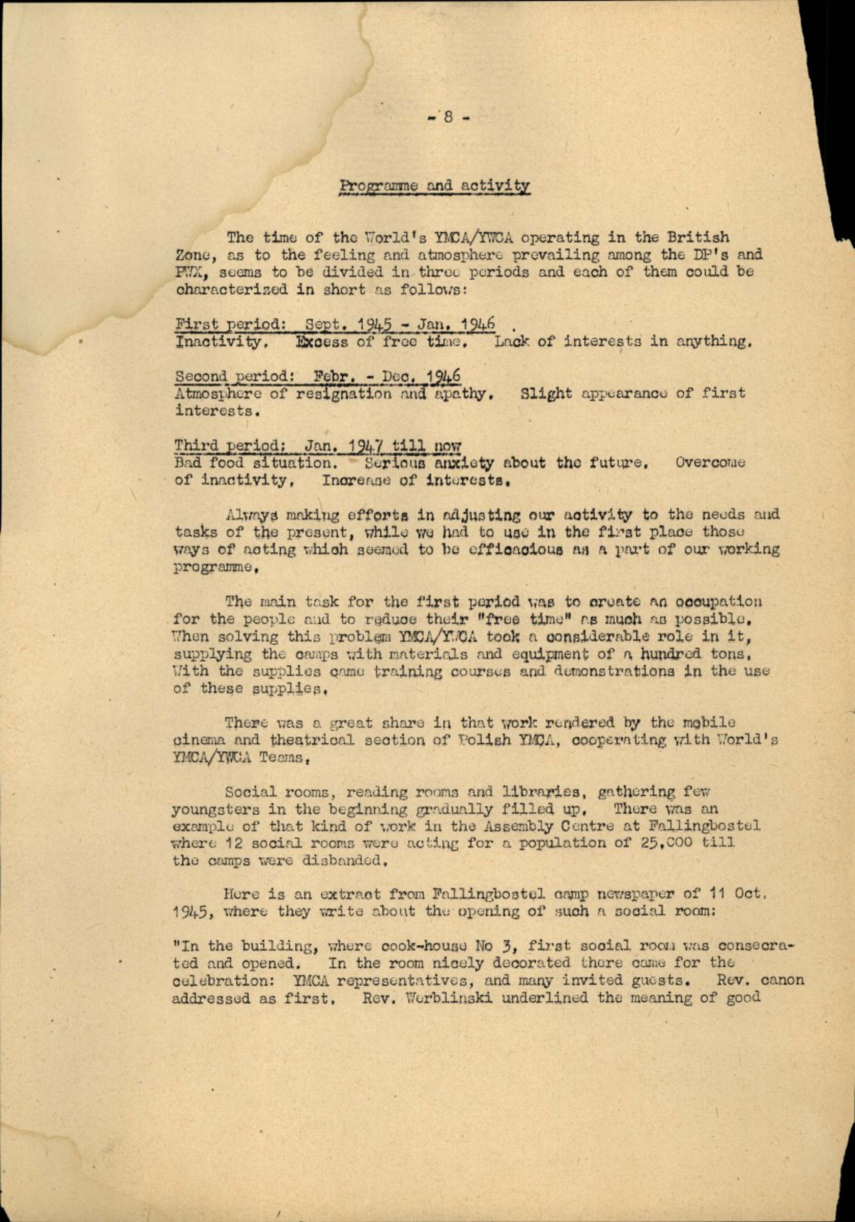 The time of the World's YMCA/YWCA operating in the British Zone, as to the feeling and atmosphere prevailing among the DP's and PWX, seems to be divided in three periods and each of them could be characterised in short as follows: