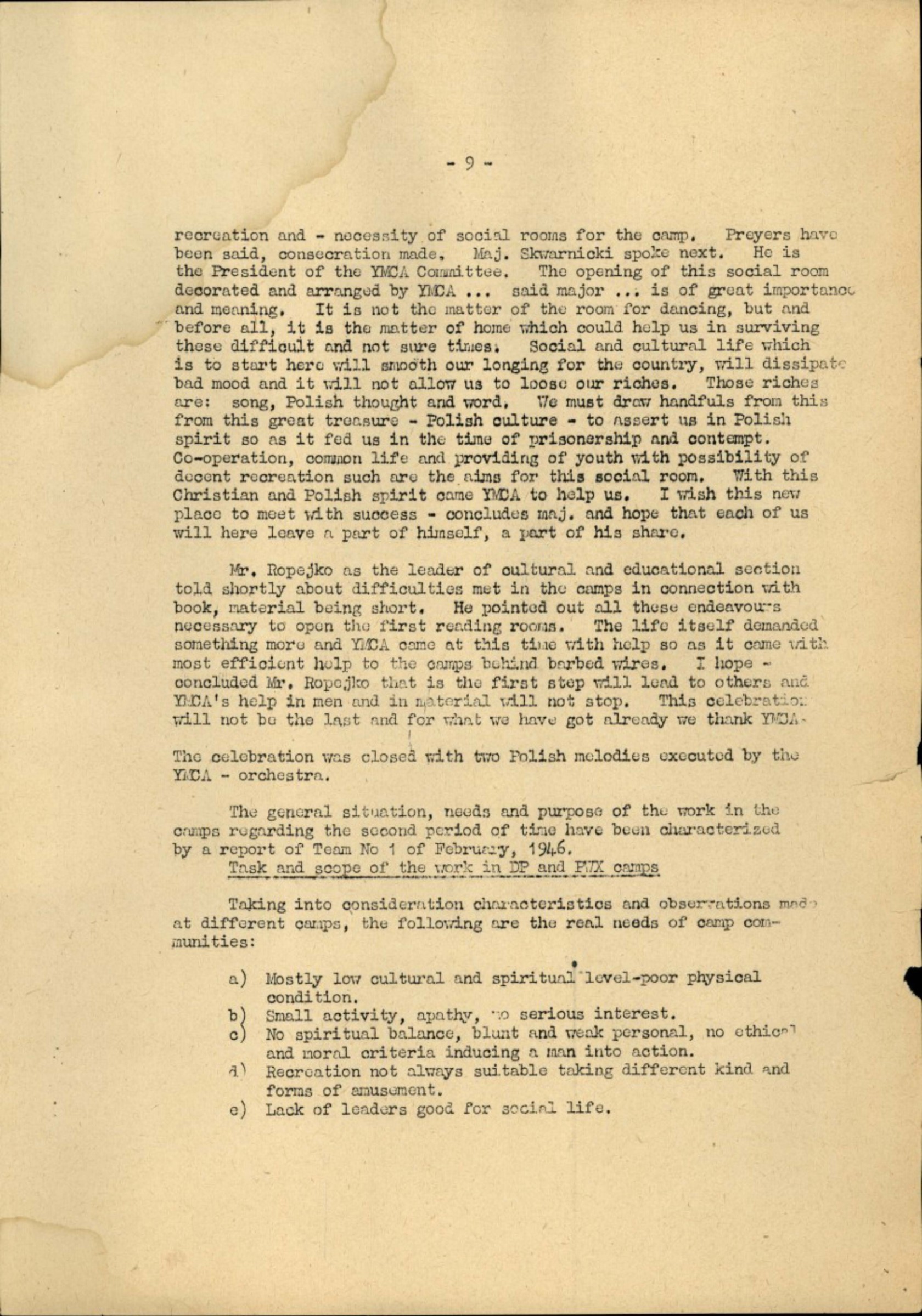The general situation, needs and purpose of the work in the camps regarding the second period of time have been characterized by a report of Team No 1 of February, 1946.