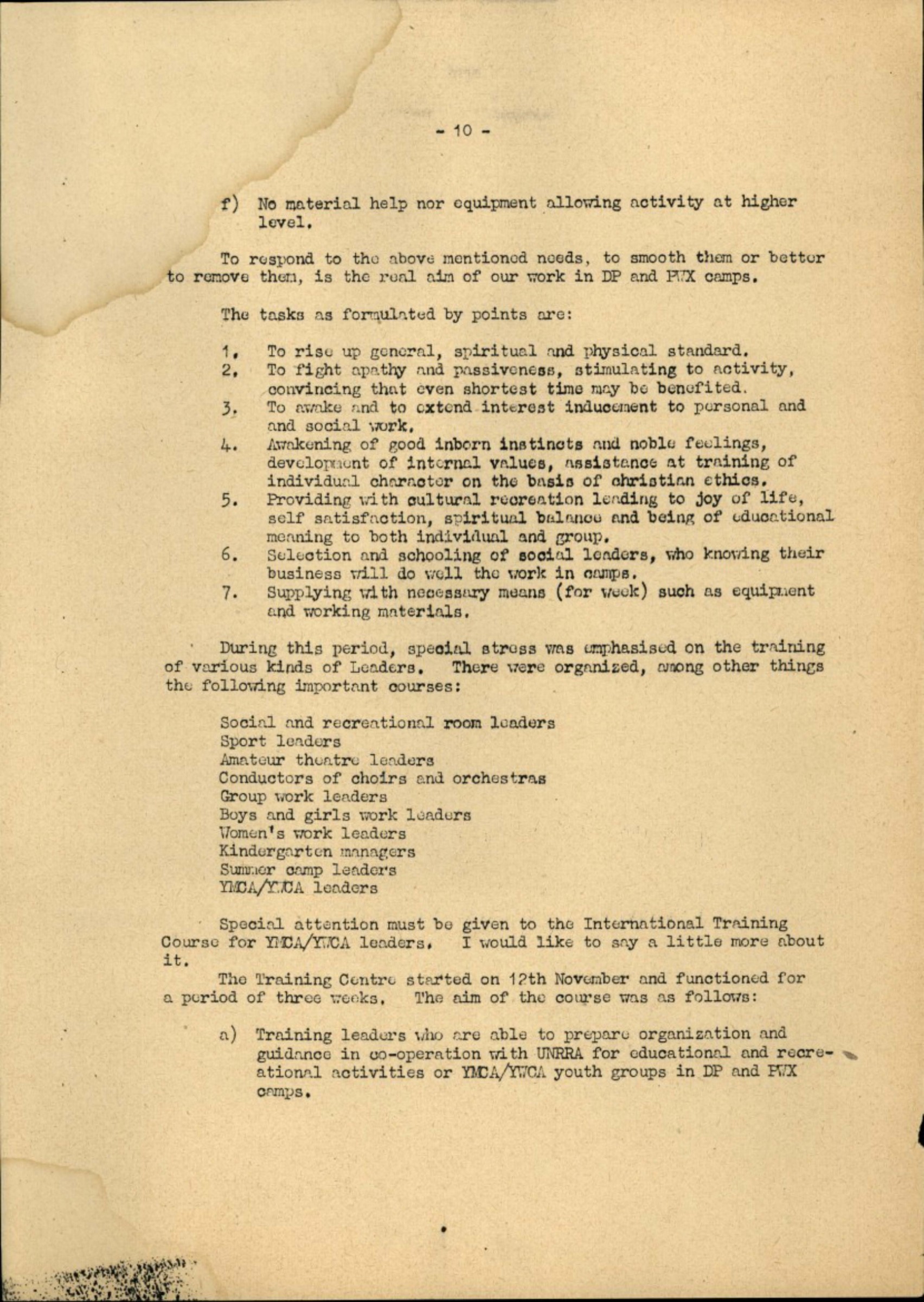10. After the second breakfast (10,30 a.m.) had some short courses of special interest or lectures. Groups for a choir, theatre, first aid, wood carving, painting, modeling (plastelin), some elemental knowledge about nature (mushrooms, trees etc.); YMCA/YWCA history, organization, general aims and special tasks during the war and after with DP's.