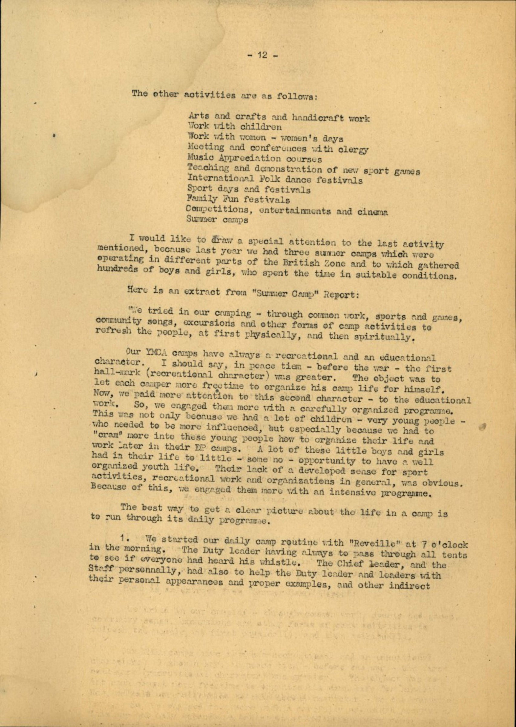 I would like to draw a special attention to the last activity mentioned, because last year we had three summer camps which were operating in different parts of the British Zone and to which gathered hundreds of boys and girls, who spent the time in suitable conditions.
