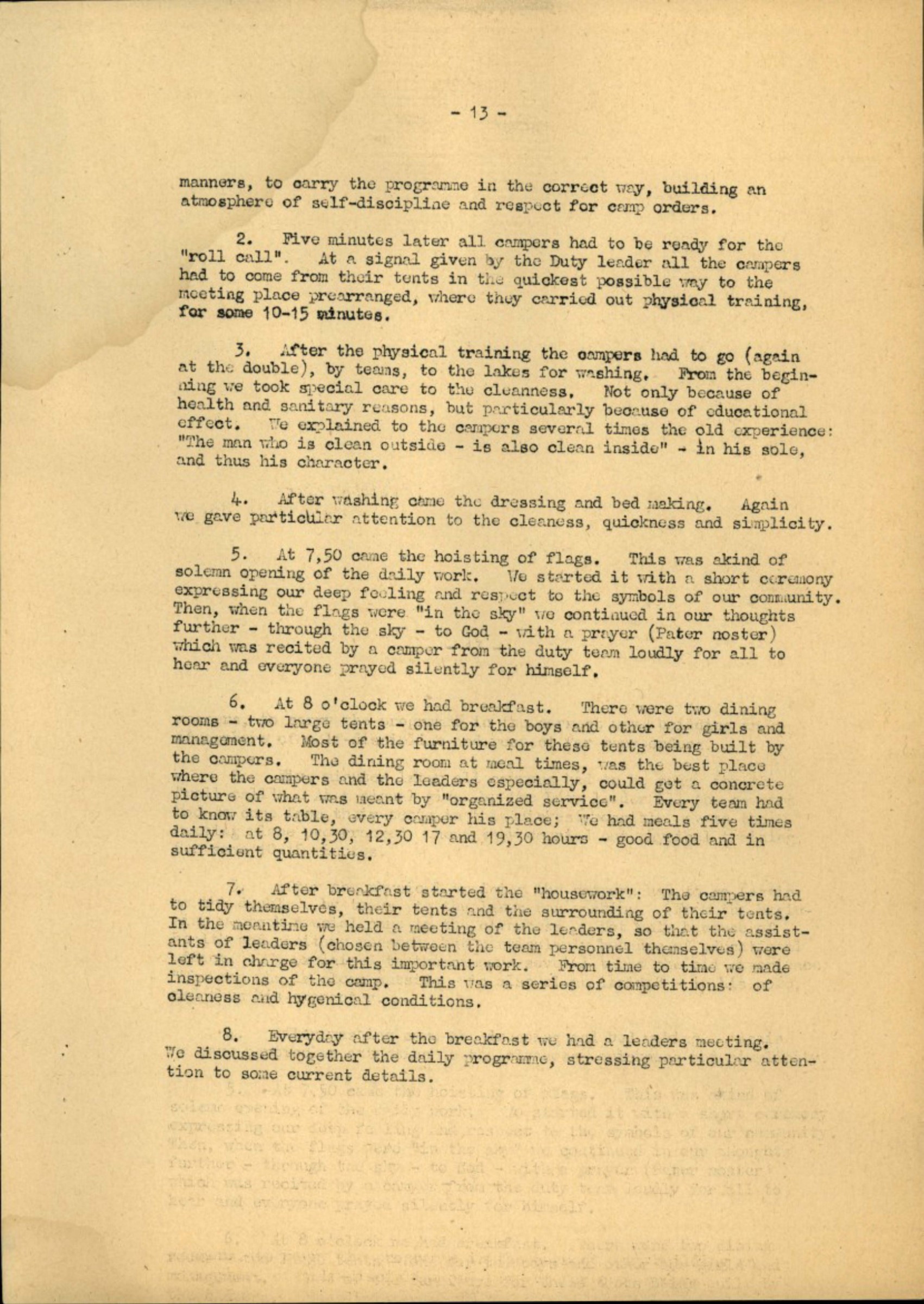 1. We started our daily camp routine with "Reveille" at 7 o'clock in the morning. The Duty leader having always to pass through all tents to see if everyone had heard his whistle. The Chief leader, and the Staff personnally, had also to help the Duty leader and leaders with their personal appearances and proper examples, and other indirect