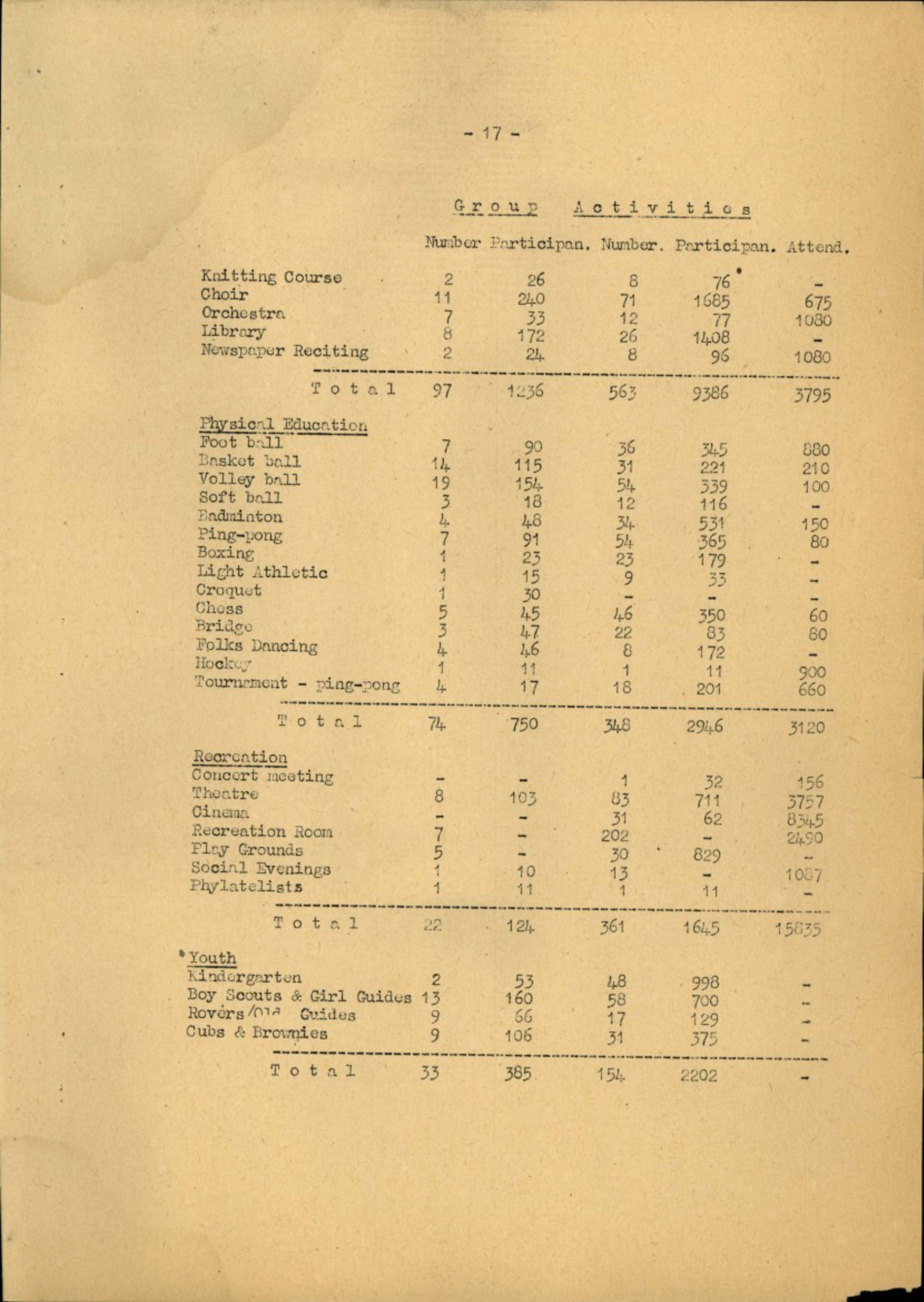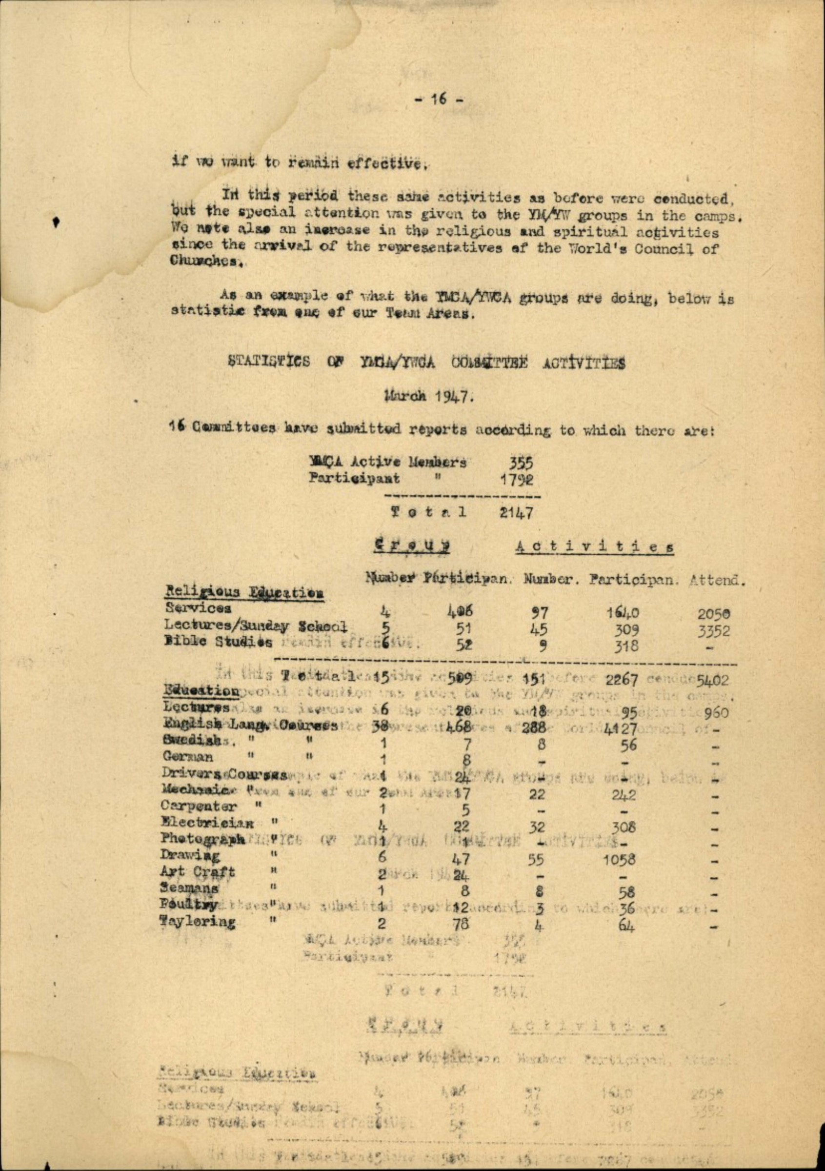 In this period these same activities as before were conducted, but the special attention wasgiven to the YM/YW groups in the camps. We note also an increase in the religious and spiritual activities since the arrival of the representatives «f the World's Council of Churches.