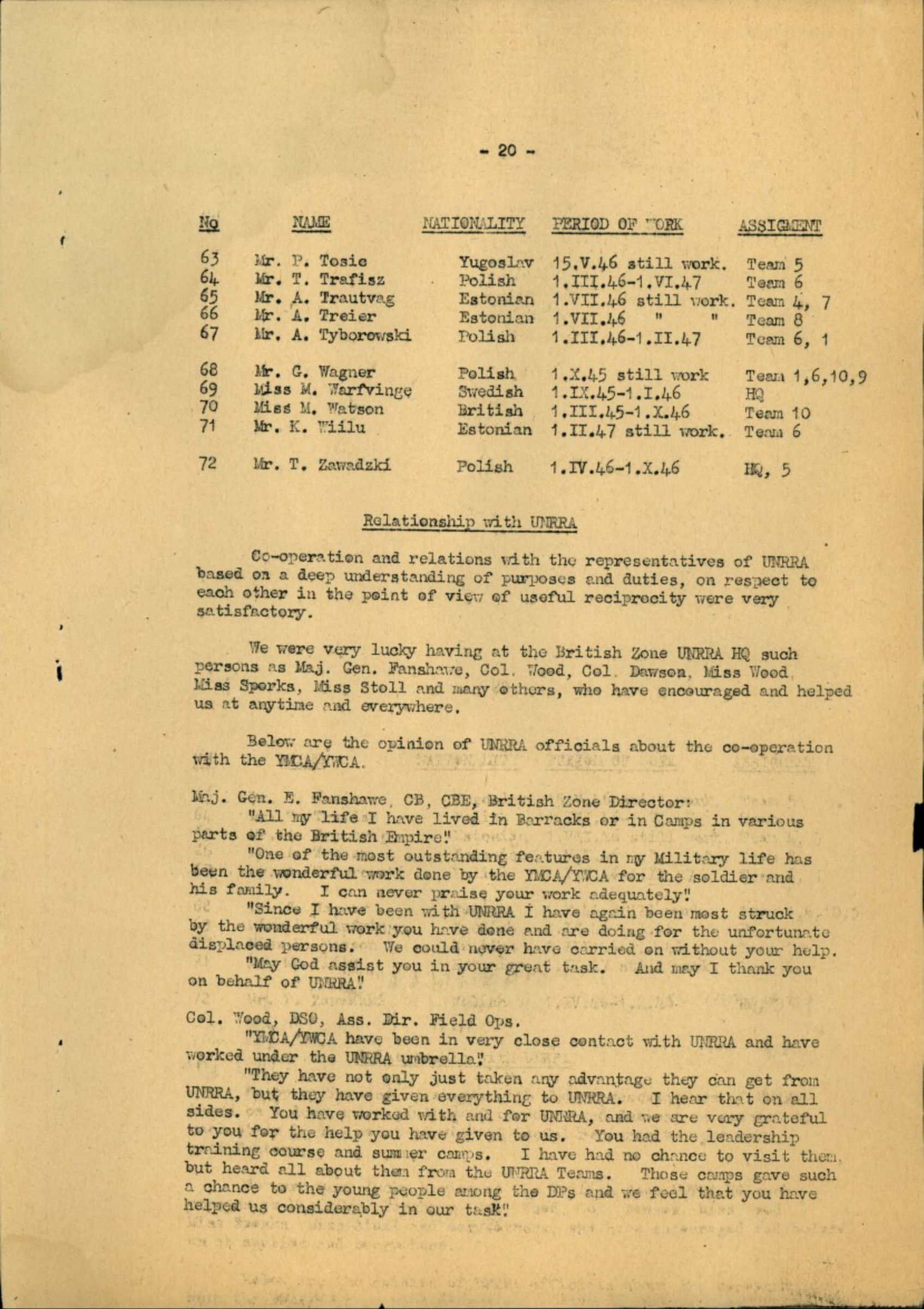 We were very lucky having at the British Zone UNRRA HQ such persons as Maj. Gen. Fanshawe, Col. Wood, Col. Dawson, Miss Wood, Miss Sporks, Miss Stoll and many others, who have encouraged and helped us at anytime and everywhere.