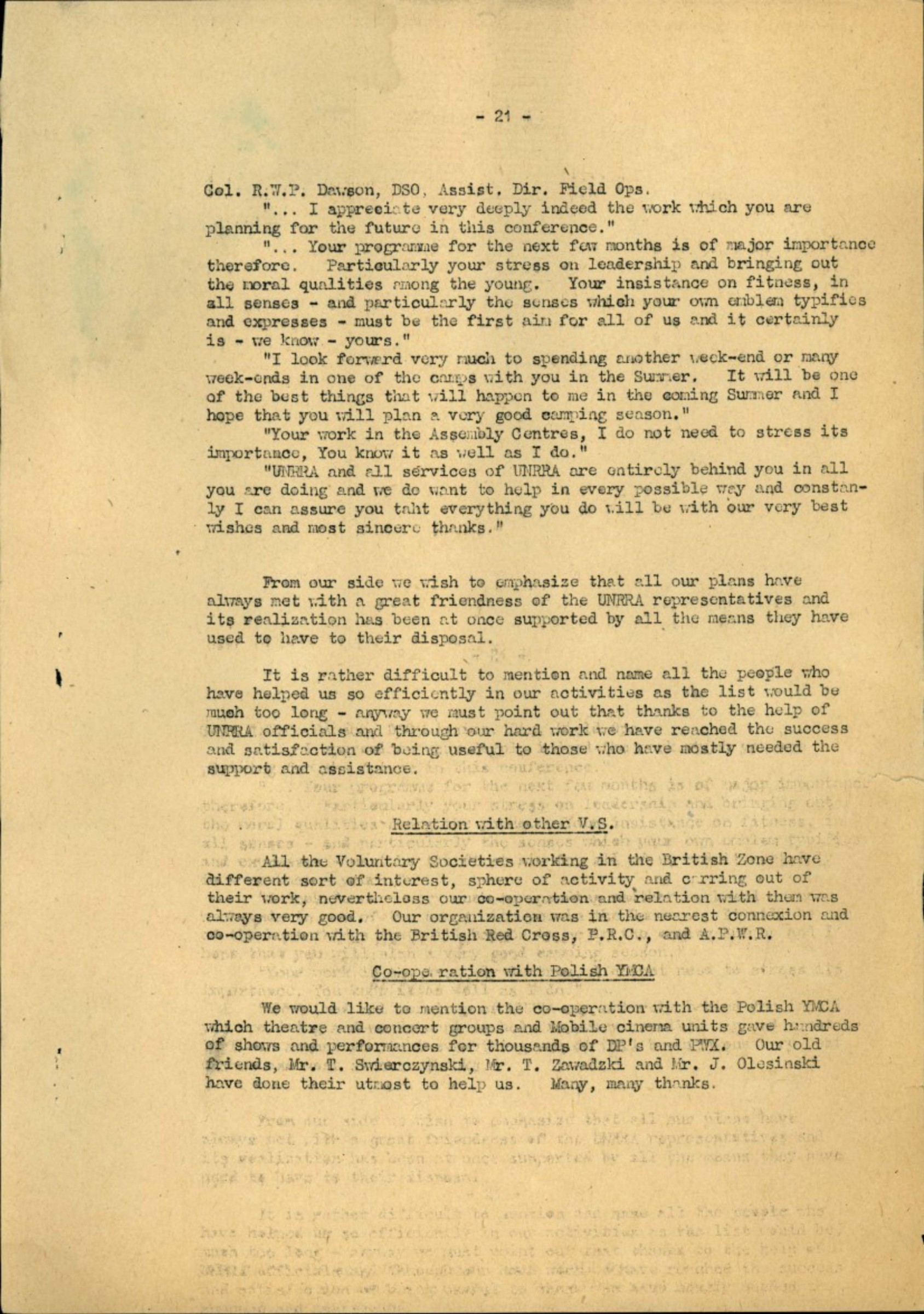 We would like to mention the co-operation with the Polish YMCA which theatre and concert groups and Mobile cinema units gave hundreds of shows and performances for thousands of DP's and PWX. Our old friends, Mr. T. Swierczynski, Mr. T. Zawadzki and Mr. J. Olesinski have done their utmost to help us. Many, many thanks.
