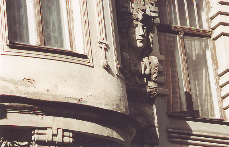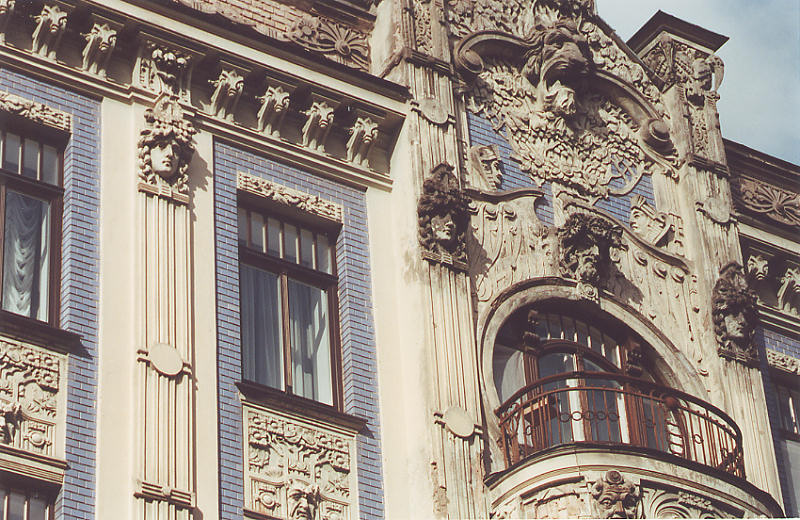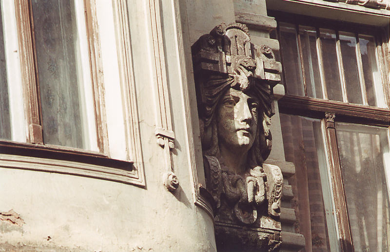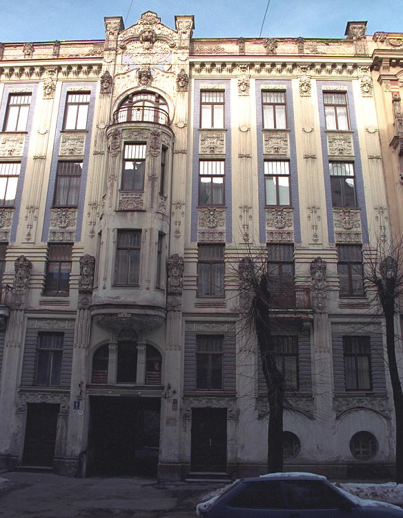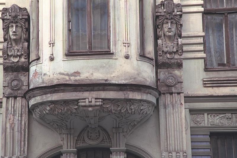 No. 8 Alberta iela is another eclectic Eisenstein architectural masterpiece. The imposing projecting risalit1 comprises the centerpiece of the building, with arboreal and lion motifs. The facade is divided by pilasters topped with female heads2 Window moldings feature monsters keeping the inhabitants safe.
