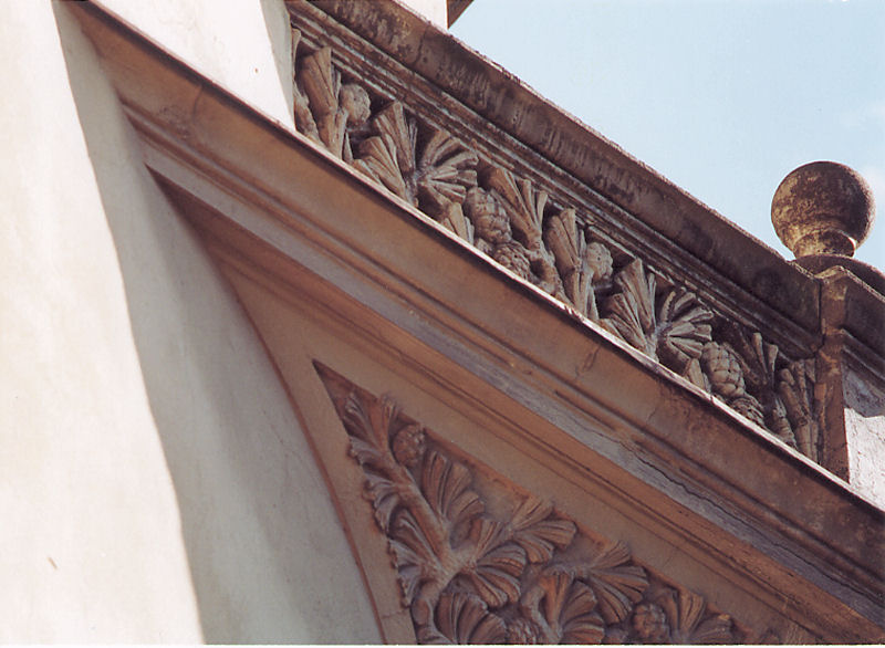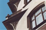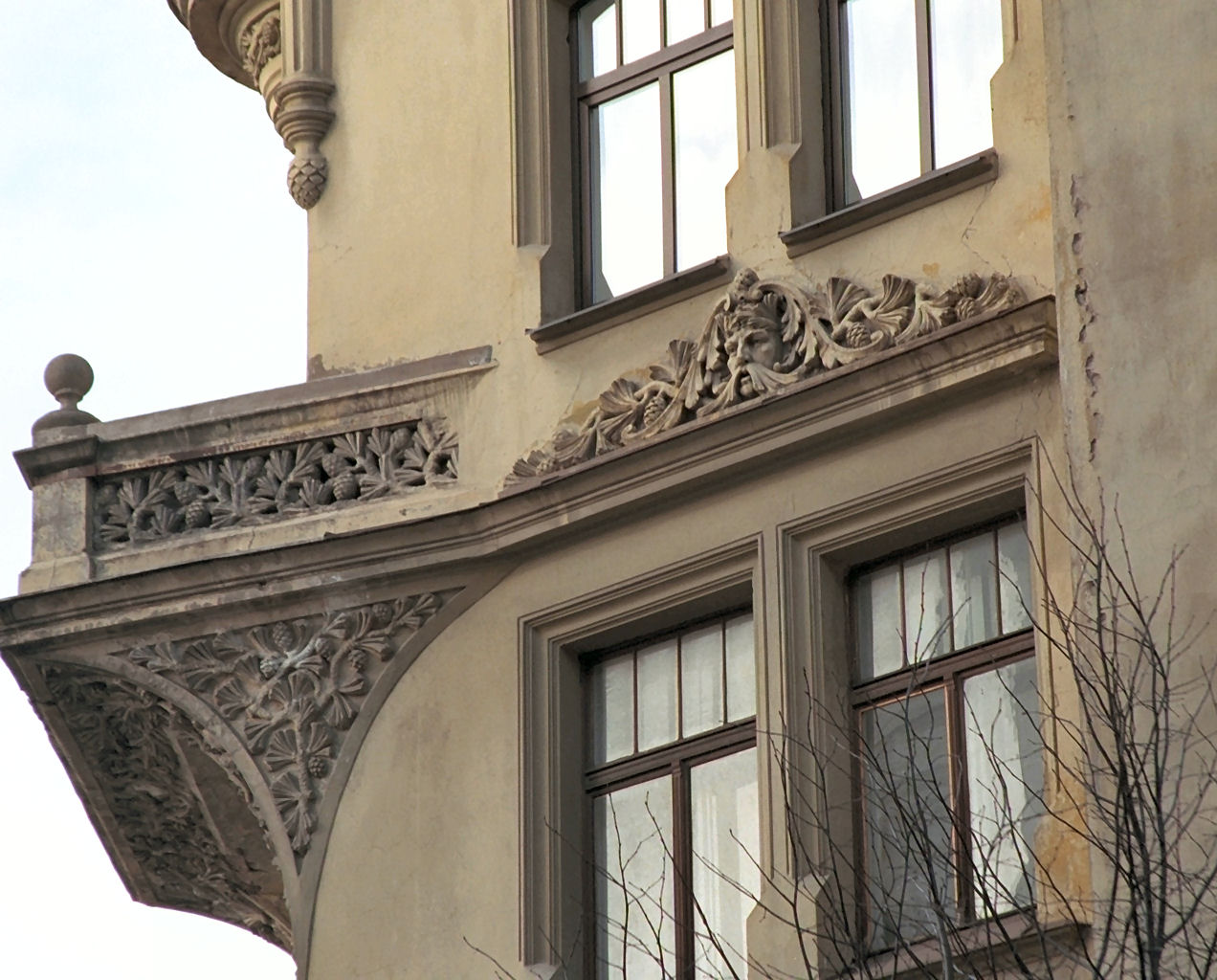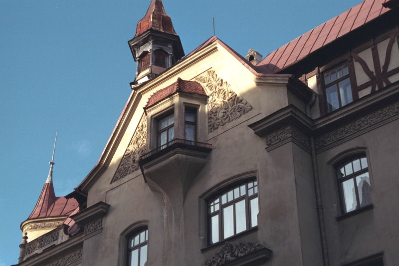 It has a number of prominently projecting risalitas, bay windows, balconies, loggias2, gables, a corner tower and massive entrance portals. The style can best be descibed as an homage to national romanticism. Architectural forms include ornamental reliefs of stylized native plant and animal motifs—cones, needles, squirrels. Apartment windows feature stained glass windows depicting exotic plants. The stairwell features a winding staircase with paintings on the ceiling above. Until 1907 the ground floor contains Pēkšēns personal apratment and workshop. The fifth floor is the painter Janis Rozentāls; and writer Rudolfs Blaumanis' apartment. The museum includes the loft built for the artist's workshop. Rozentāls was the most prominent artist of the Jugendstil period in Latvia. He lived and worked here from 1904 to 1915. The workshop is an authentic representation of the atmosphere of the time.