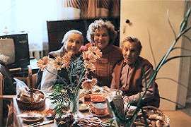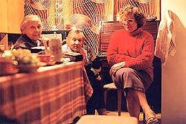 Mom, Gaida, Laura and flowersGaida joins us for a picture at the table. Below, a short pause in the conversation as brunch has continued into dinner. Laura has a new friend in her lap, Ester's cat, Pice. (Ester is Gaida's son's Arno's wife. I promise to put a family tree into one of these albums some day!) Eventually, we finish off the evening with a couple of rounds of coffee - my aunt Laura is the other coffee fiend in the family, though thankfully in lower doses than mine! And I finally head off for a good night's sleep.