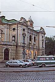 Here's the theater, by evening twilight. It reminded me of an old, ornate Broadway theater. The tickets were an incredible bargain, less than two dollars for us all. But for folks making $40 or $80 a month, it's still quite a bit of change. So it was no surprise that everyone turned out in their best dress. All except me, that is. I came in a black turtleneck, blue jeans, waterproof Timberland boots, and my favorite beat-up leather jacket. Oh well, at least I didn't commit a total faux pas -- the boots were clean!